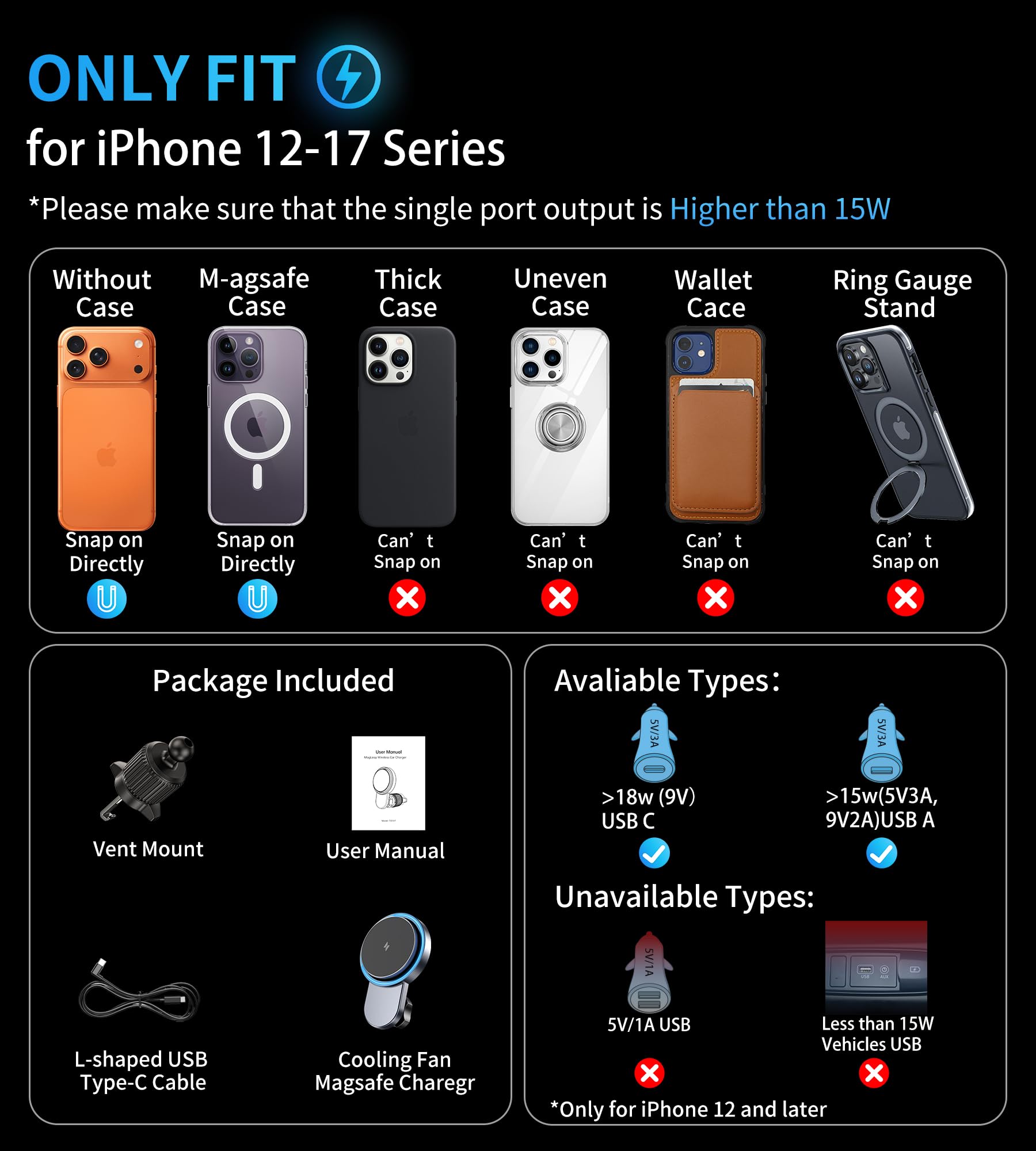 GuMosh for Magsafe Car Mount Charger with Cooling Fan, Fast Magnetic Car Phone Holder, Strong Hook Car Vent Phone Mount, Magnetic Wireless Car…