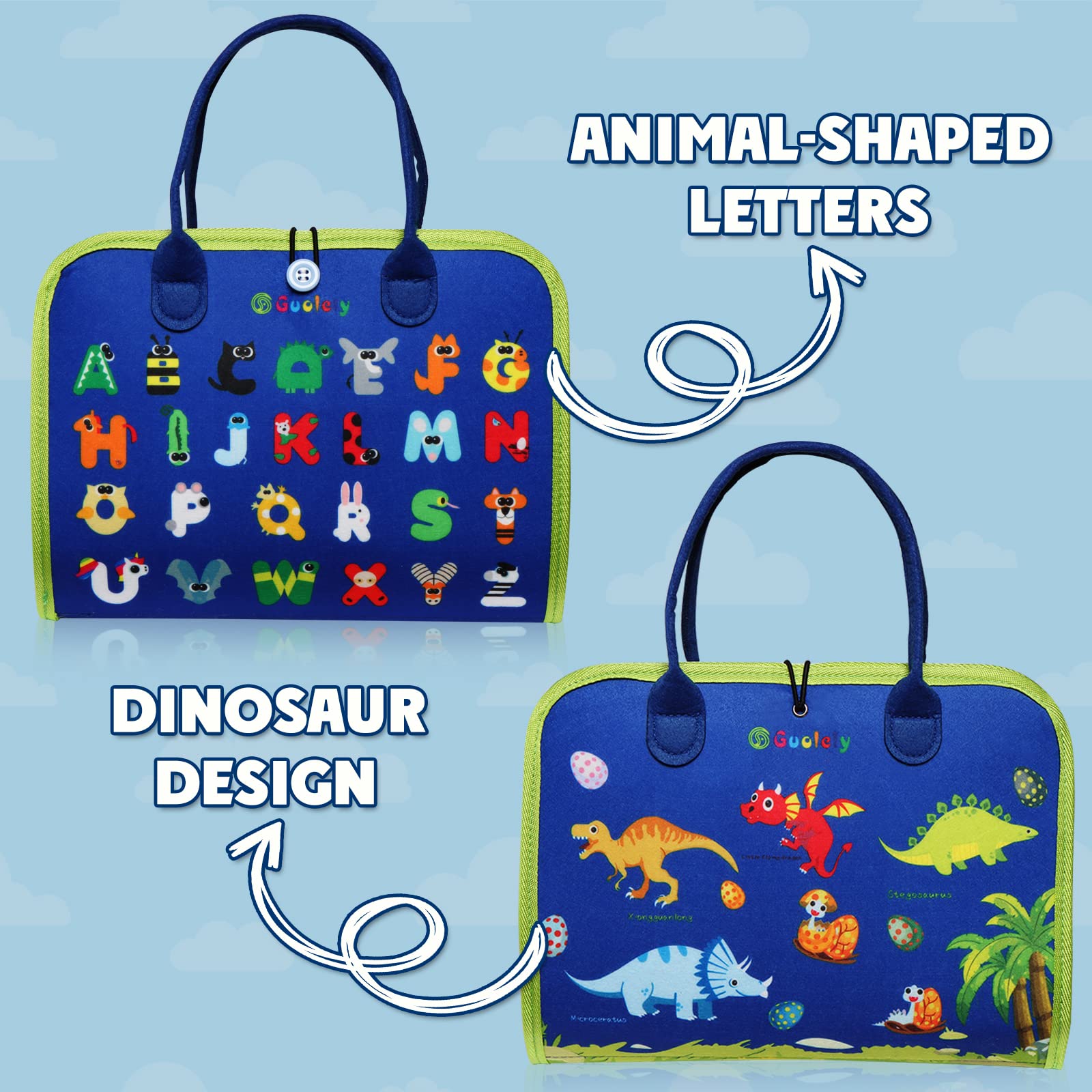 - 🎁️PERFECT GIFT FOR KIDS - This Montessori busy board is uniquely designed with dinosaurs elements and 26 kinds of animal-shaped English letters to appeal to any child. It is a perfect gift for 1-6 years old toddlers as Birthday, Carnival Prize, Christmas, Halloween, Thanksgiving, Contest prizes. Surprise your kids with our amazing busy board.