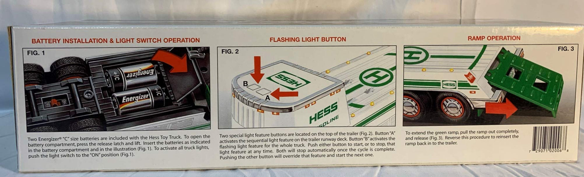 The Hess toy truck, a tradition for 42 years. The 2006 Hess Truck and Helicopter comes with a large white and green tractor with flashing headlights, a flatbed trailer equipped with sequencing landing lights, and a fully-functioning battery powered helicopter with operating rotors and rear stabilizers. The trailer has push button activation for flashers and 31 individual working lights on the rear of the trailer.