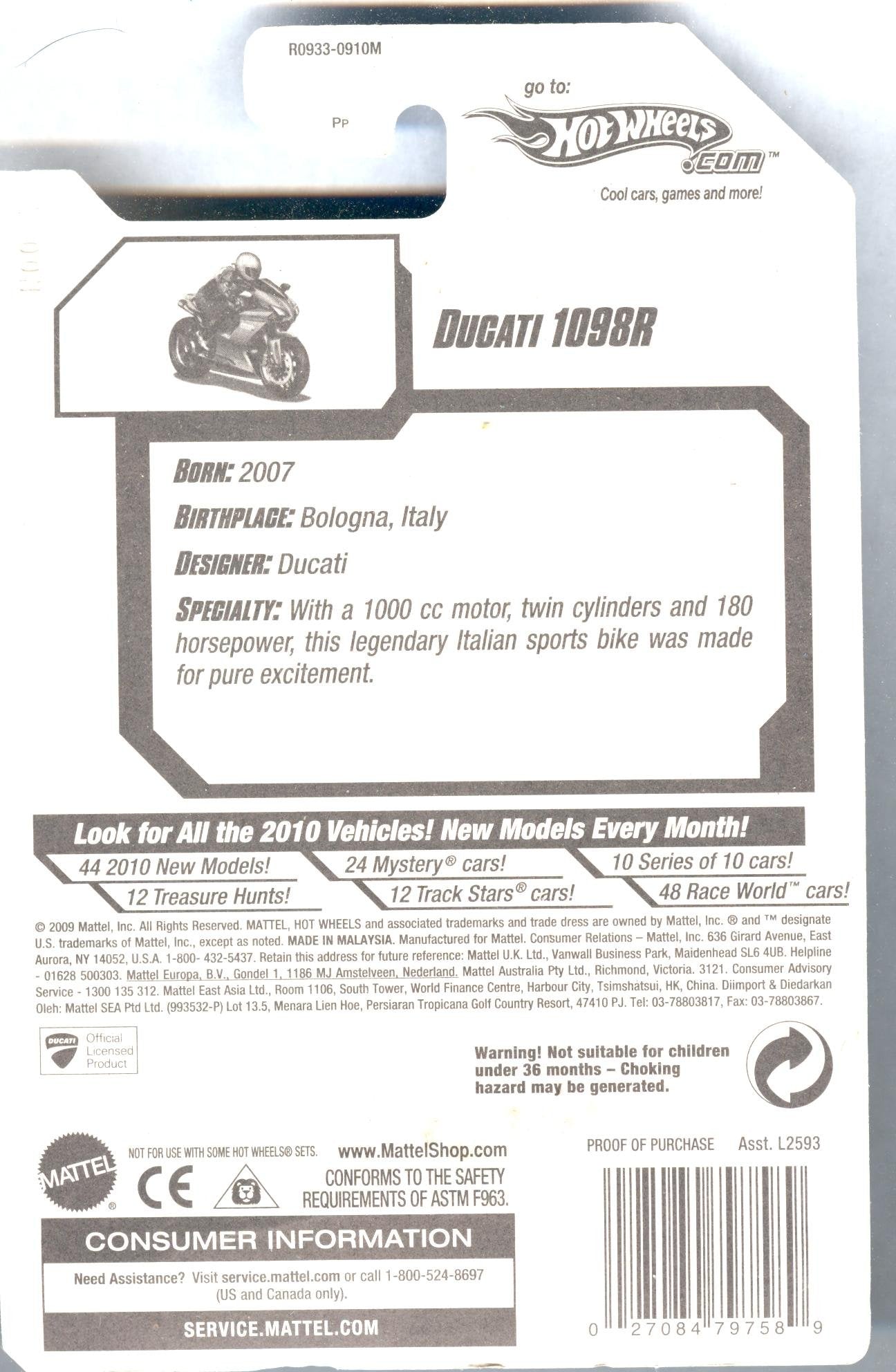 DUCATI 1098R Hot Wheels 2010 New Models Series Red DUCATI 1098R 1:64 Scale Collectible Die Cast Bike #17/44