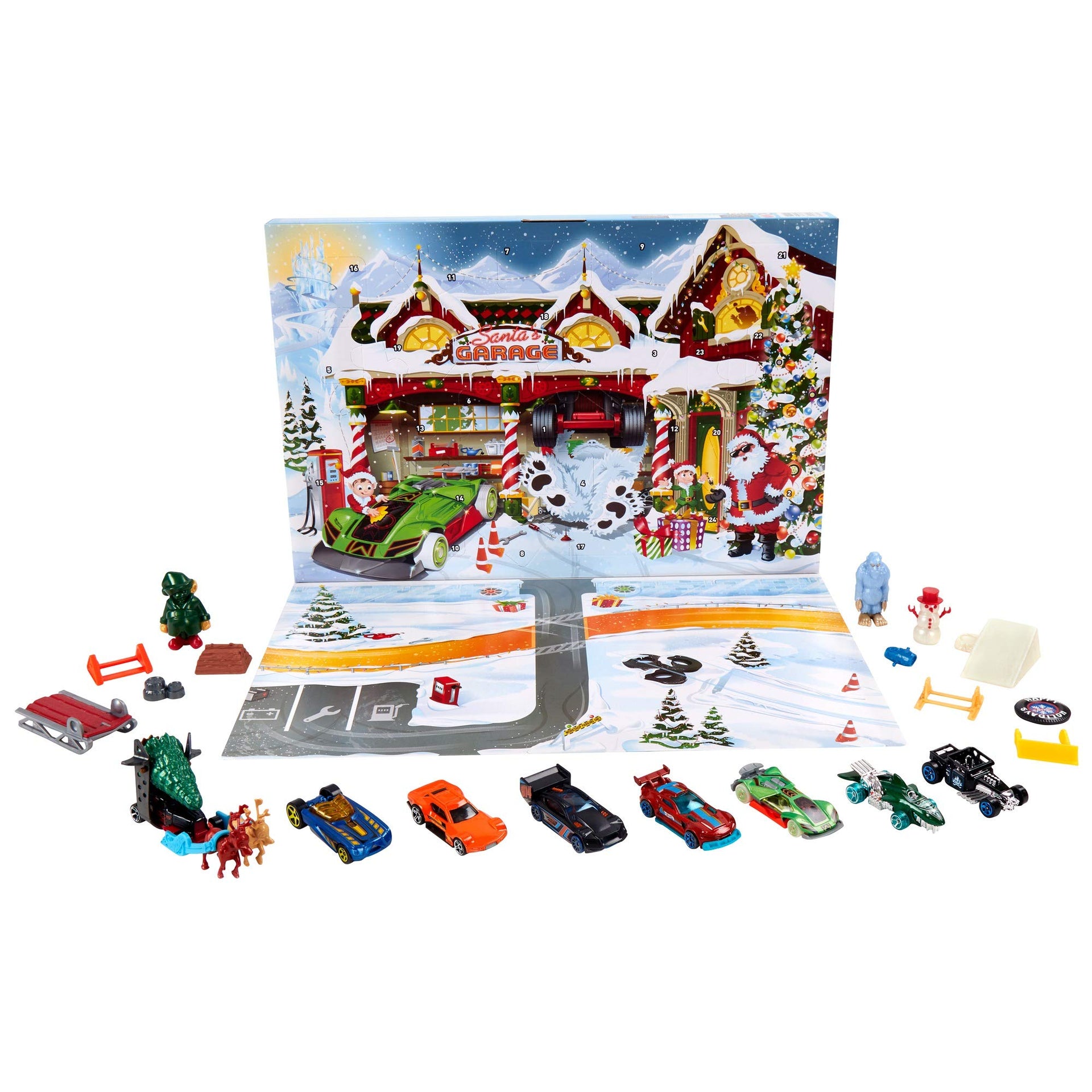 Make the holiday season a cool countdown with colorful Christmas-themed packaging and 24 windows for a daily surprise. Start unlocking surprises on the first day of December for a Christmas Day countdown Hot Wheels style! This Hot Wheels Advent Calendar will delight kids of all ages. There are eight decorated Hot Wheels vehicles and sixteen accessories for every day leading up to the holiday. The Hot Wheels Advent Calendar now includes a foldout playmat for kids to play with their new Hot Wheels vehicles and accessories!