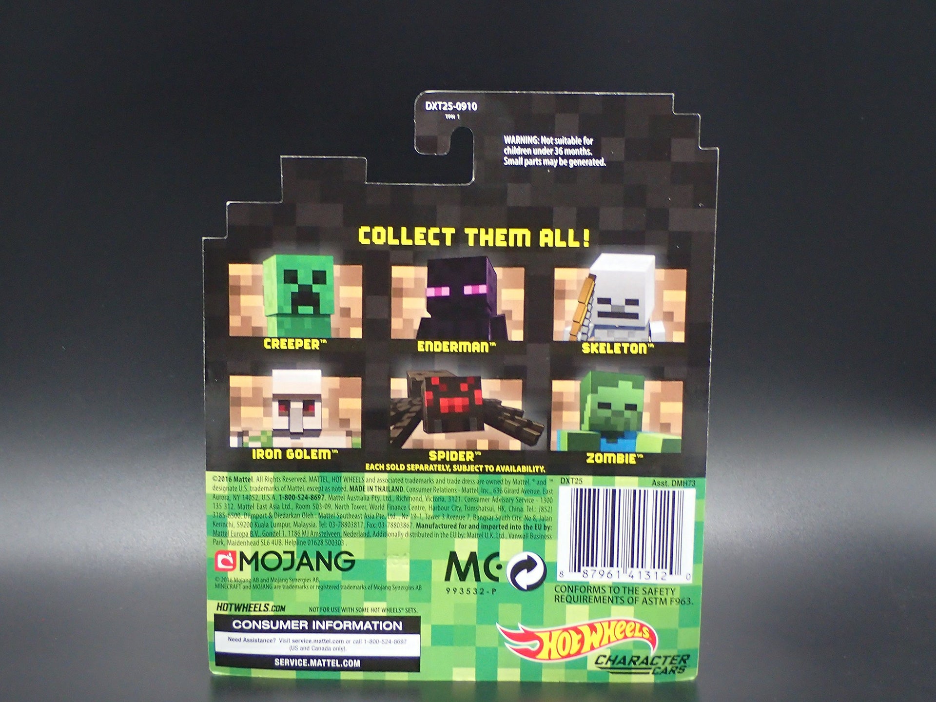 Your favorite character from Minecraft in this realm as a Hot Wheels Character Car! Hot Wheels and the wildly popular video game come together so you can simulate authentic game moments and live out your Minecraft adventures with some of the baddest mobs in car form! Get busy with these 1:64 scale vehicles designed carefully to represent characters from the textured cube world of Minecraft. Your favorites like Creeper, Enderman, Skeleton, Iron Golem, Spider and Zombie come in rich colors and decos true to their appearance in the game. Race off to fun or display your favorite Character Car proudly. Each sold separately, subject to availability. Colors and decorations may vary.