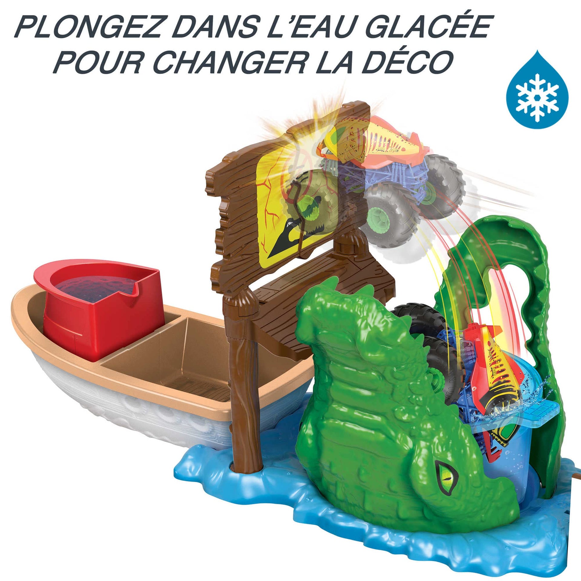 • Squeeze hard to save yourself in the Monster Trucks Swamp Chomp Playset from Hot Wheels and watch Color Shifters vehicles come out of the water with different colors and designs.