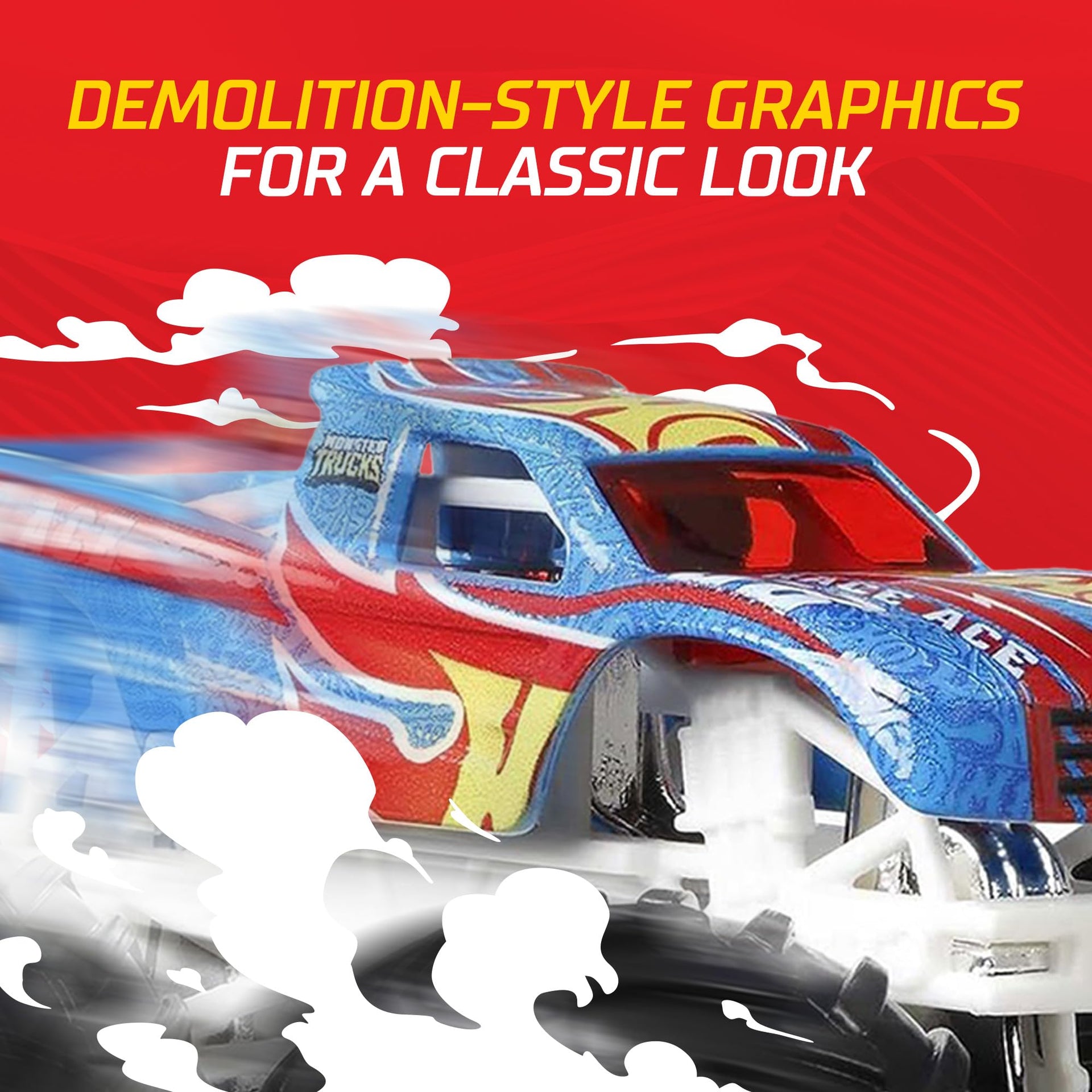 Just like the real-size trucks in the live show, these heroic Hot Wheels Monster Trucks have unique and outrageous personalities that make them entertaining and awesome. Each 1:64 scale truck is a fan-favorite with features kids know and love. With eight star-powered Monster Trucks in one pack, it's an instant collection and inspires total mayhem right out of the box! Recreate epic destruction from the Monster Trucks Live show with such characters as Race Ace, Bone Shaker and Tiger Shark, or let this multipack be an introduction to all the smashing and crashing that Monster Trucks has to offer. Colors and decorations may vary.