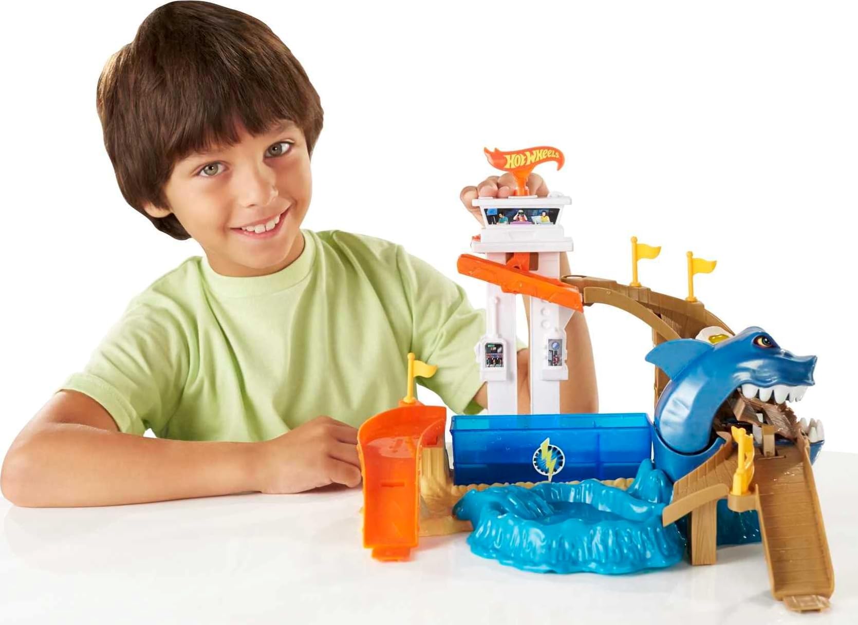Product DescriptionEscape the giant car-chomping shark in this exciting, action-Packed, color-changing thrill ride. Speed down from the top of the tower ramp, but watch out the shark is hungry for some metal munchies and ready to trap your vehicle in his chomping jaws! If you get caught, send another vehicle down the ramp and aim for the release lever. Hit it just right and you’ll launch your trapped car to safety. Miss and you could fly off the track-then both of your cars are shark food! Sharkport Showdown comes with a Color Shifters car and two color-change zones: a dunk tank and splash pool.From the ManufacturerHot Wheels Color Shifters Shark Splashdown Trackset: This shark chomps cars. Race on the track, change colors and defeat the shark. Ejector launches cars off the track. 2 color-change zones for twice the fun. Includes trackset and 1 car.