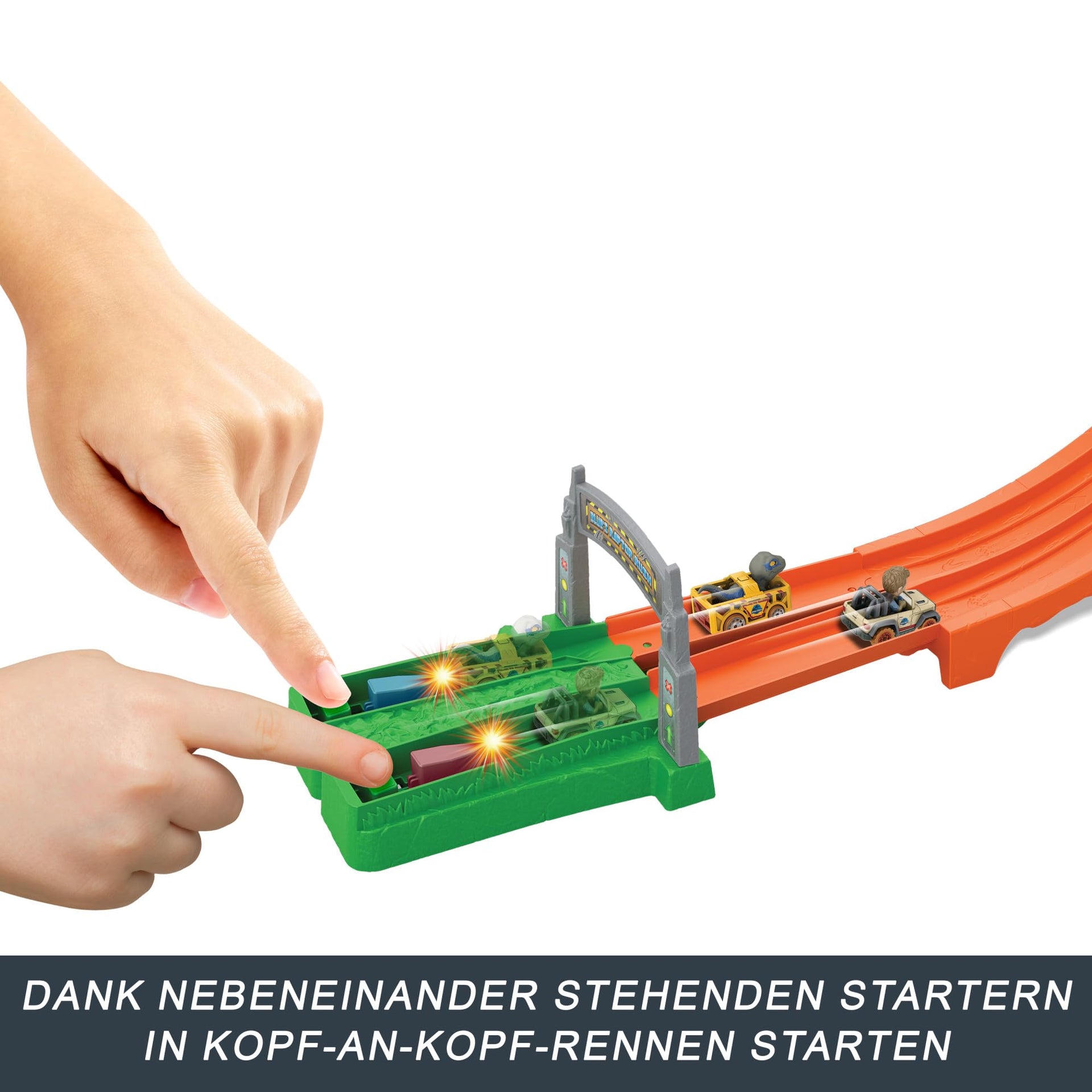 Race to escape Jurassic World island in this Hot Wheels RacerVerse track set that features a drag race and a zipline at the finish. It includes die-cast racers Blue the Raptor and Owen with non-removable figures in the drivers' seats of die-cast Hot Wheels vehicles that are primed for track racing. The fastest racer will make it to the watchtower and zipline to safety while their opponent will fall into the open mouth of the awaiting Mosasaurus. The set folds in half for easy storage. Color and decorations may vary.