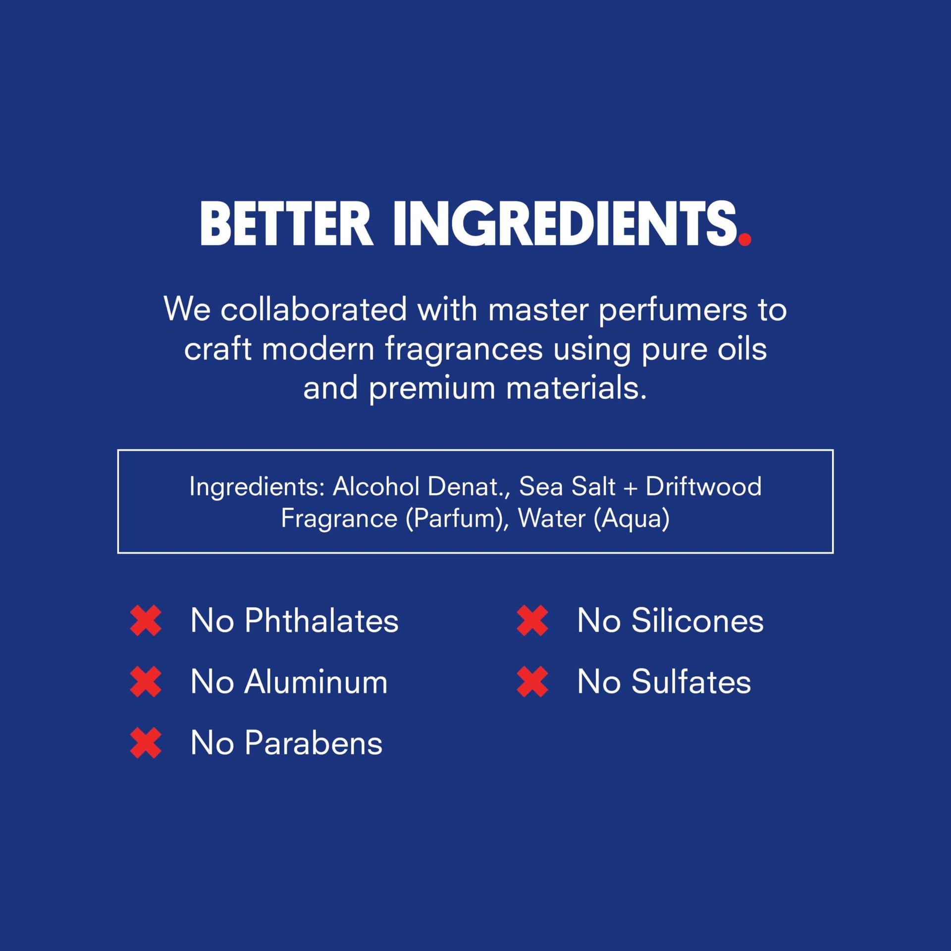 - SEA SALT + DRIFTWOOD: Opens with clean, aromatic notes of mandarin, cardamom, blue sage and lavender surrounded by the freshness of salted ocean air. Coastal greens combine with sea salt, driftwood and sun-bleached cedar for a scent that is dynamic, fresh and easygoing.