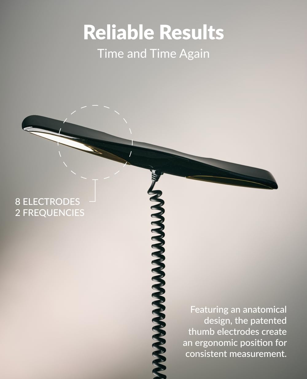 • ERGONOMIC DESIGN: Built with your body in mind, this scale with hand electrodes feature patented thumb electrodes for consistent measurement-a breakthrough in accurate scales for body weight. Unlike other body composition analyzers, the H20’s handle is ergonomic for consistent results.