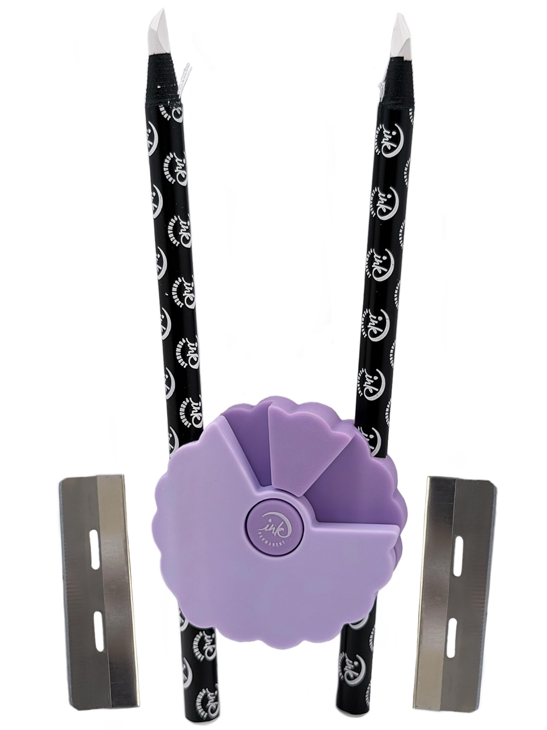 Ink Permanent Brow Mapping Compass Kit is a professional eyebrow mapping kit and brow mapping kit designed for microblading and brow design artists. The adjustable purple disk securely holds two white eyebrow pencils so you can map both brows at once - faster, cleaner symmetry for start, arch, and tail. Ideal for studios or mobile artists building a precision-focused eye brow kit. Perfect for microblading, brow mapping, lamination mapping, and cosmetic brow design. Whether you rely on eyebrow mapping string or freehand techniques with a microblading eyebrow pencil, this kit helps you achieve accurate, balanced results every time.