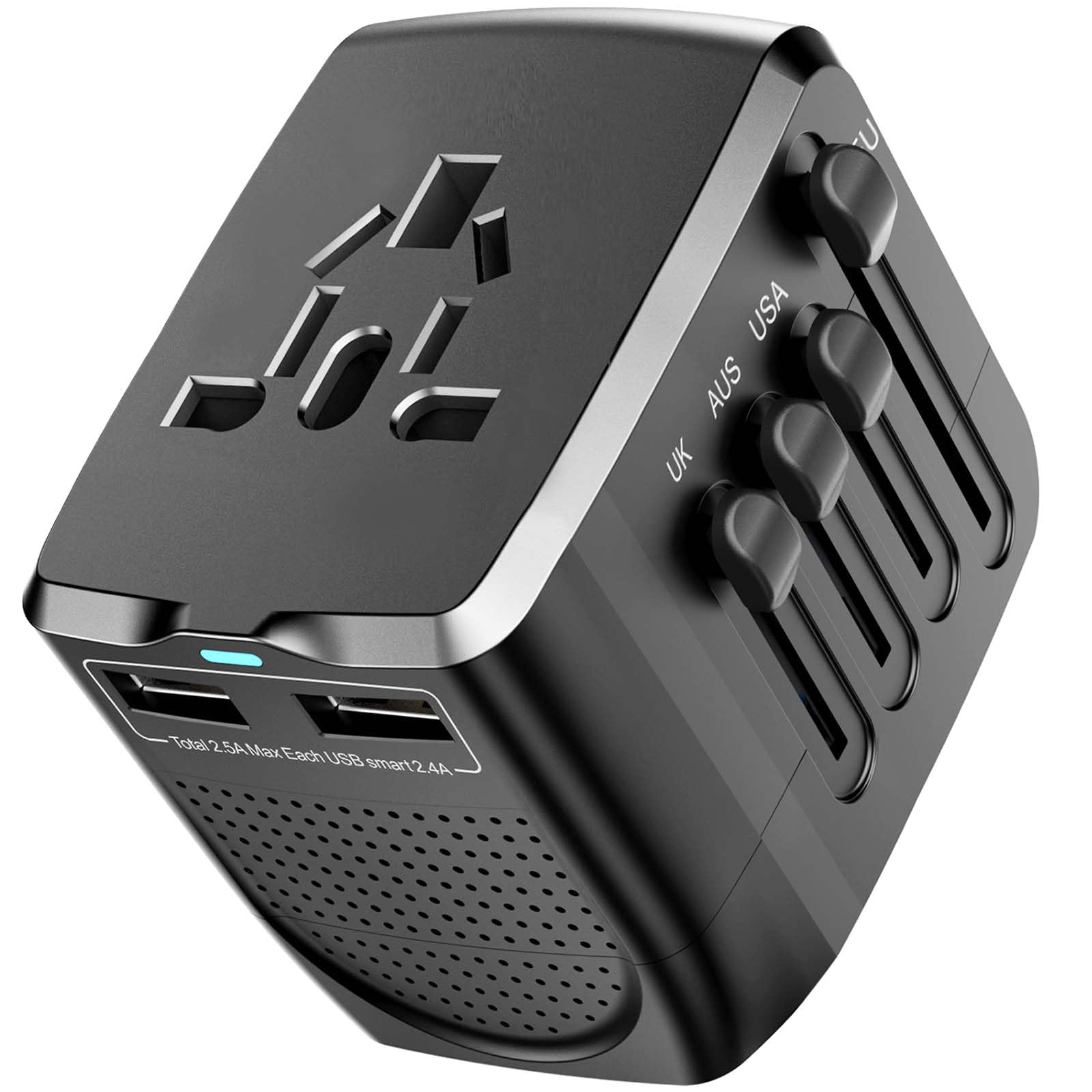 - [ ACCOMPANYING TRAVEL POUCH AND COMPACT SIZE ] - Designed for International Travel, Dual-USB output with a total current of 5V/2.4A and input with 100-240V enables you to charge two USB devices simultaneously at high speed,Which make it a portable outlet adapter for you to take the charger anywhere you go
