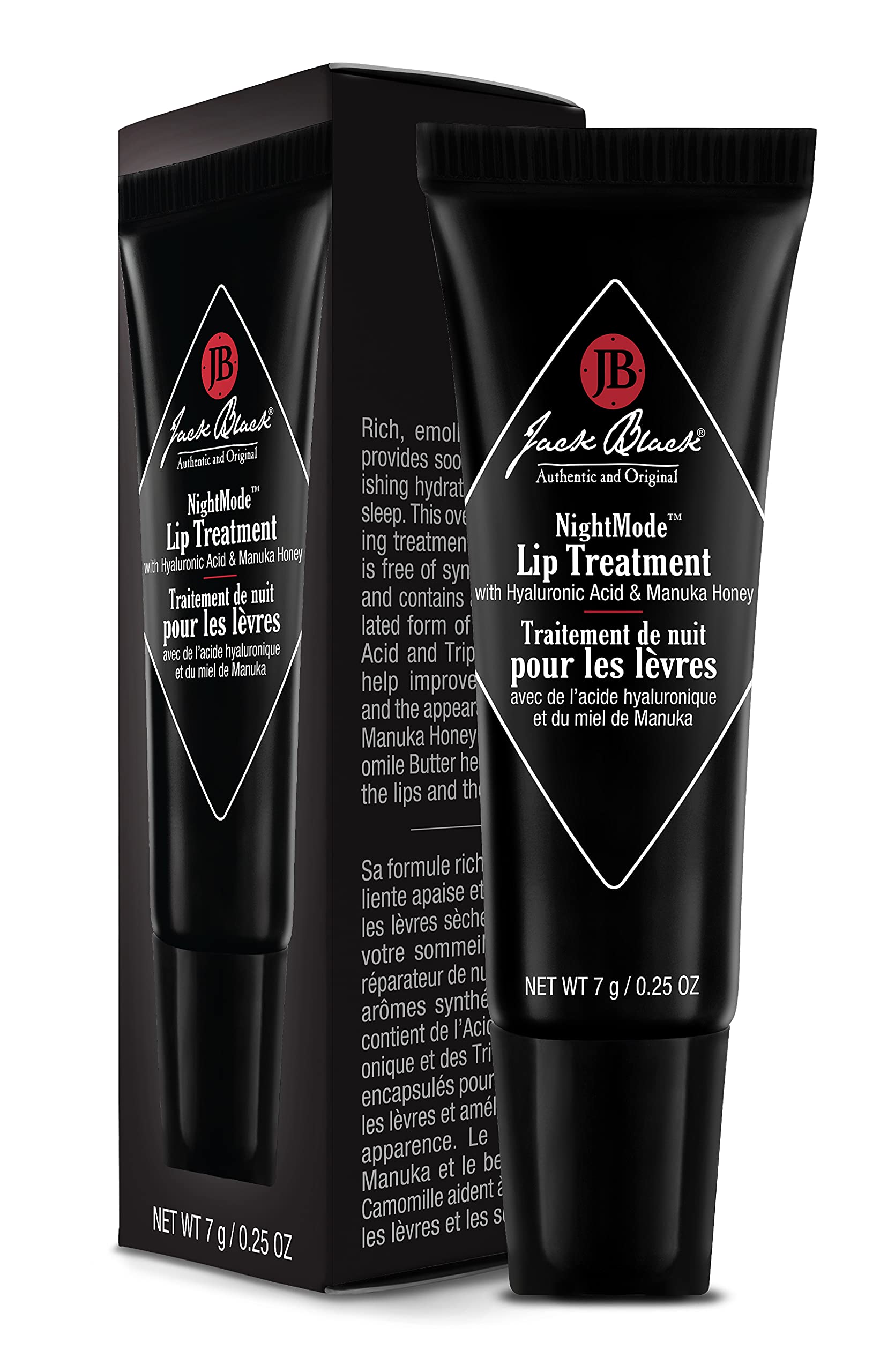 Product DescriptionRich, emollient formula provides soothing, replenishing hydration while you sleep. This overnight repairing treatment for dry lips is free of synthetic flavor, is preservative free, and contains an encapsulated form of Hyaluronic Acid and Tripeptide-1 to help improve hydration and the appearance of lips. Manuka Honey and Chamomile Butter help to soothe the lips and the senses.Brand StoryEvery Jack Black product is dermatologist tested, paraben free, cruelty free, and free of harsh surfactants. Almost all products in our line are vegan, free of artificial colorants, safe for sensitive skin, and made in the USA.