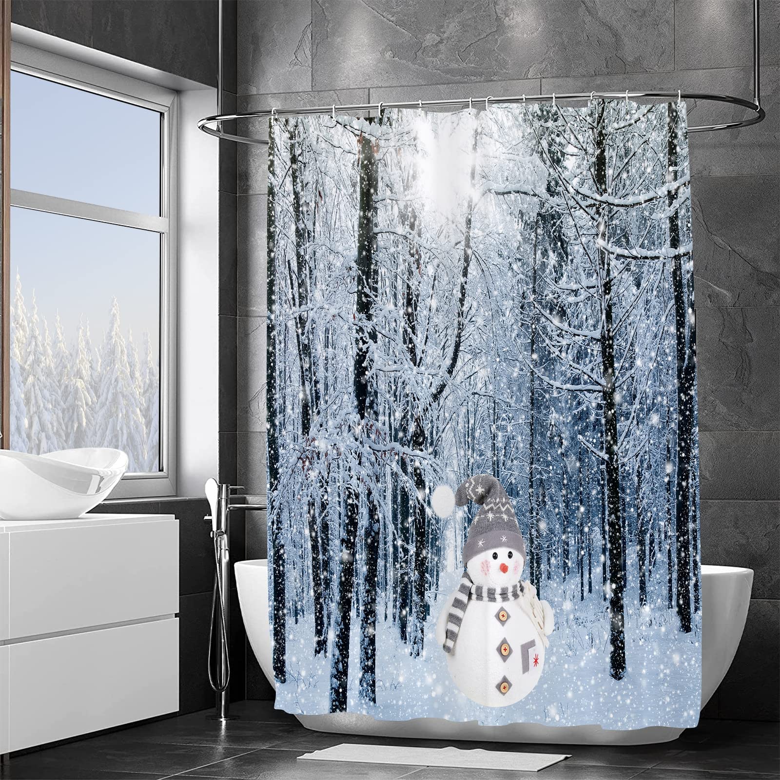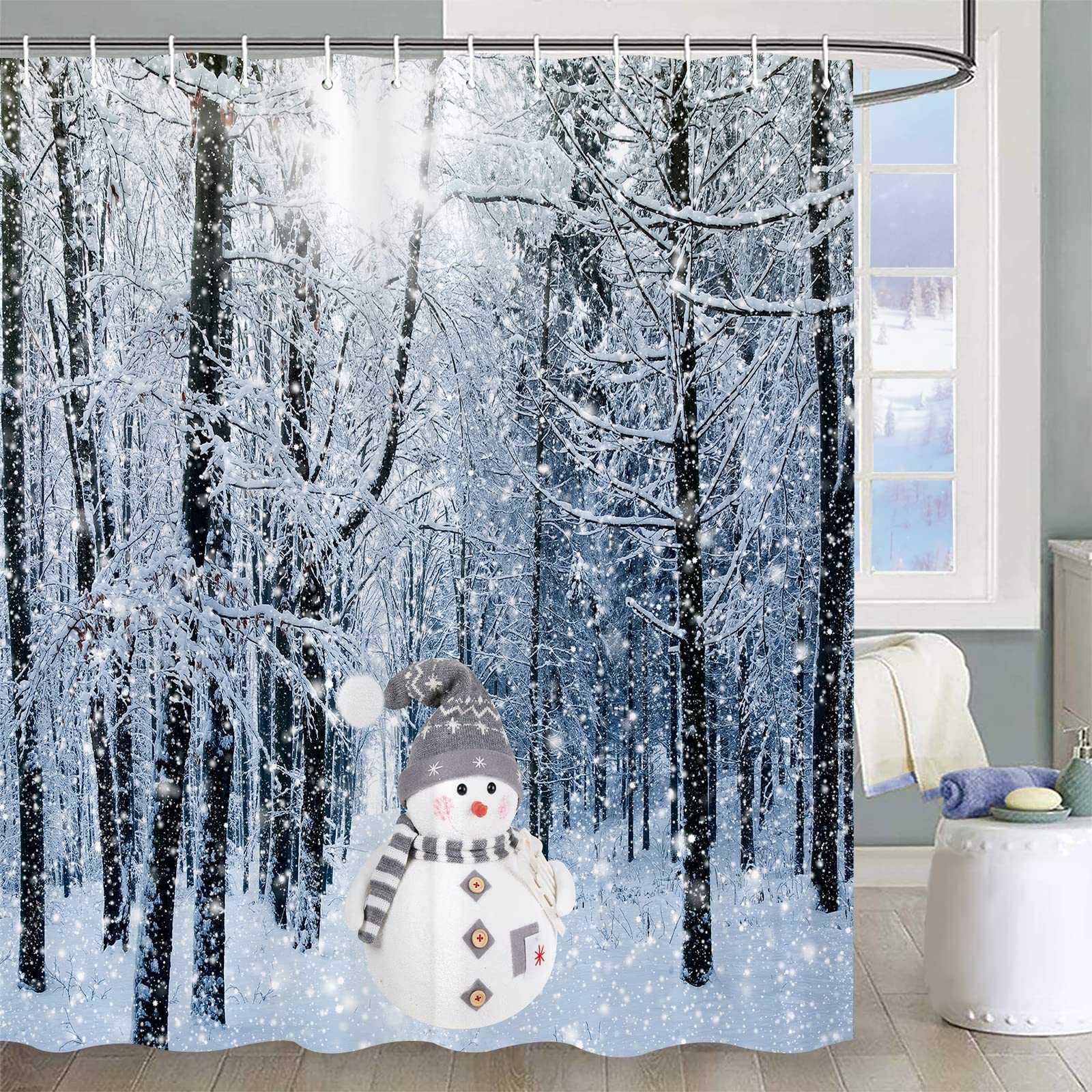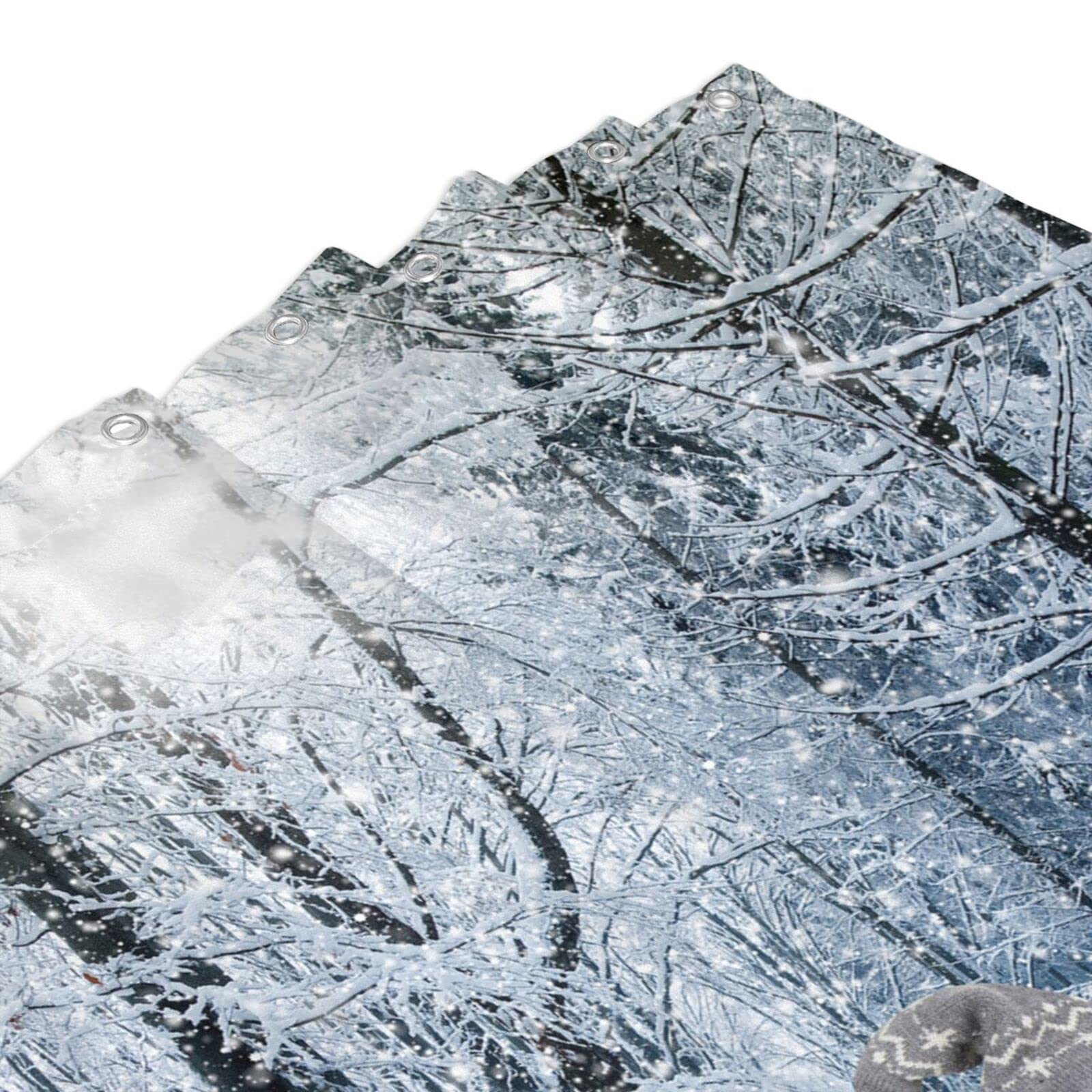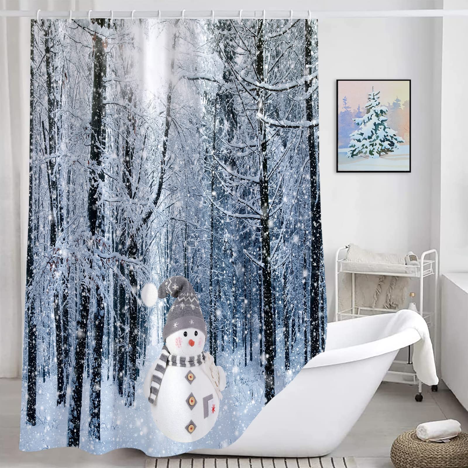 • 【Unique Design】This Christmas shower curtain is designed by elements such as winter forest, snowman, and adopts HD printing technology. Clear lines, nice colors and beautiful patterns will refresh your bathroom. This simple and classic christmas decor, could perfectly match with all kinds of home decor style, will a must-have complement for your bathroom.