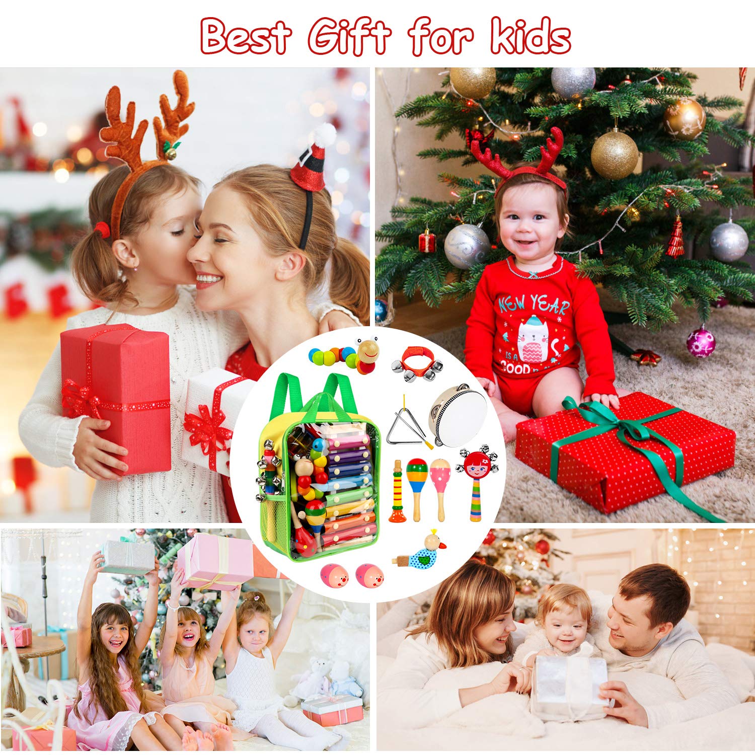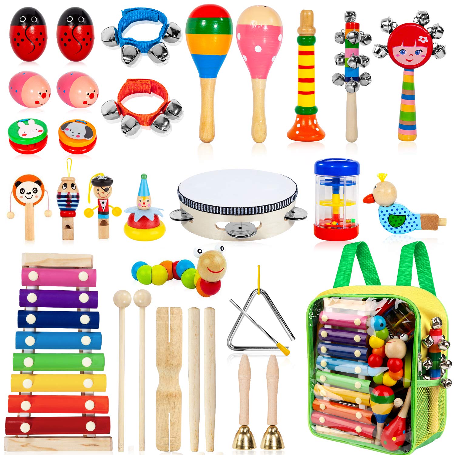 - [A Complete Kids Musical Instrument Set] - Including 33pcs 18 types shaking, tapping, beating and blowing instruments. Better way to start music than with a percussion set for preschoolers. Great and creative birthday gift for kids, boys, girls and toddlers.