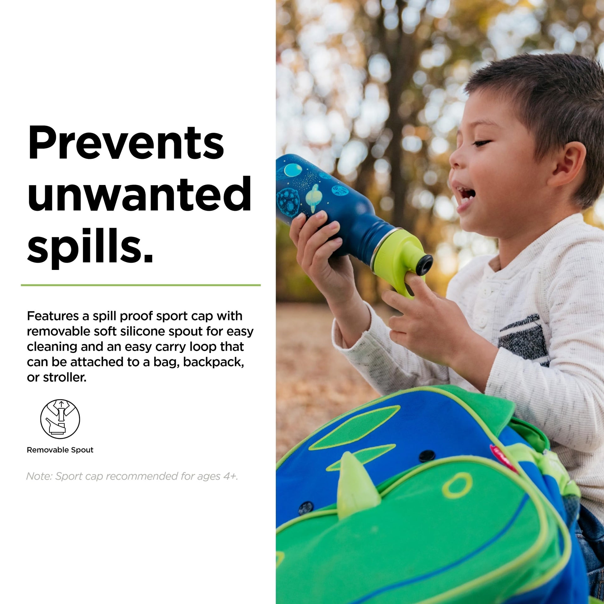 • Spill-Proof Sport Cap: Designed for kids 4+, the sport cap on this durable water bottle makes it perfect for school, sports, and outdoor adventures