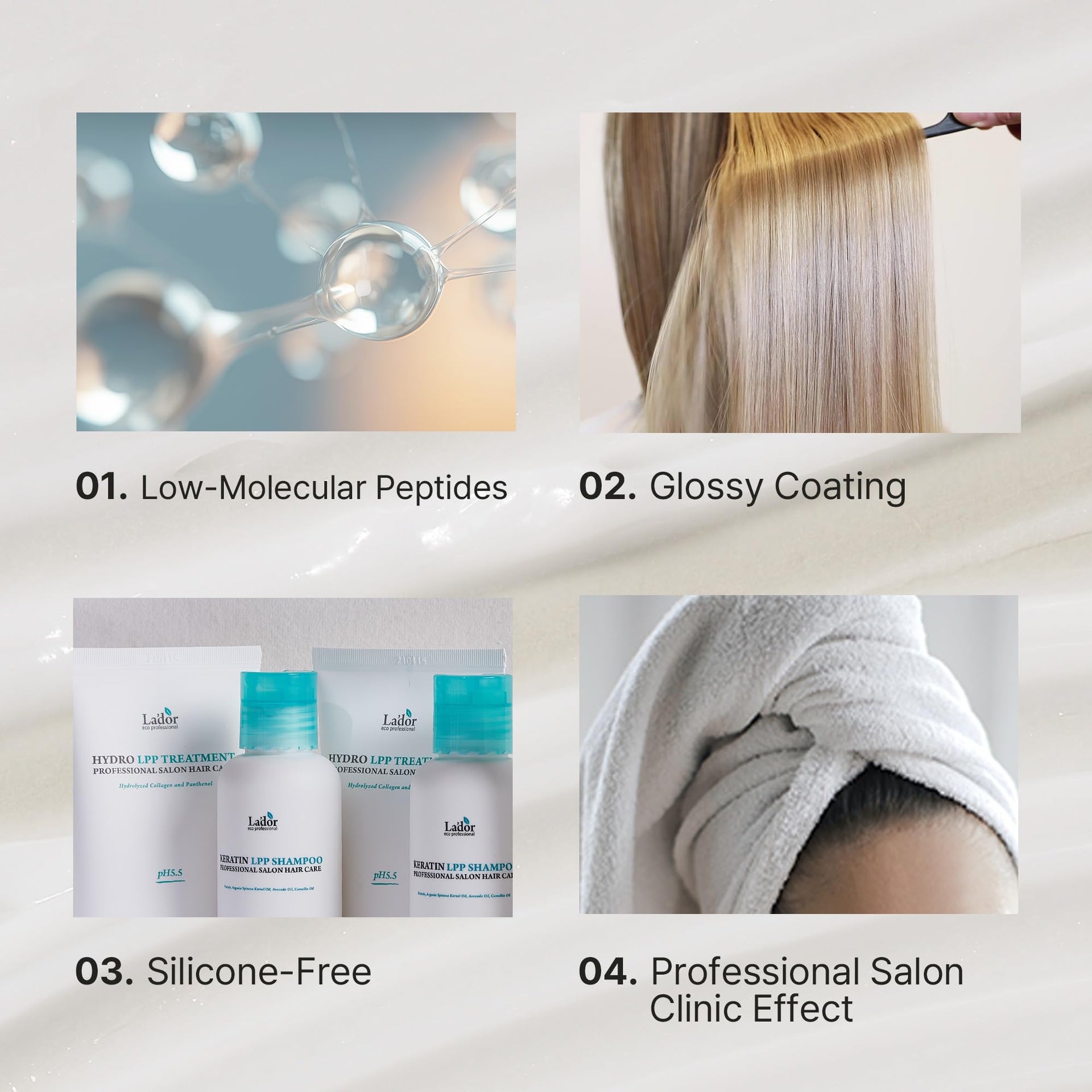 • ✔️ LOW POLYPEPTIDES - The low molecular weights of the ingredients facilitate profound infiltration into the cuticles of individual hair strands, augmenting efficacy and yielding discernible outcomes, contributing to the overall health of the hair.