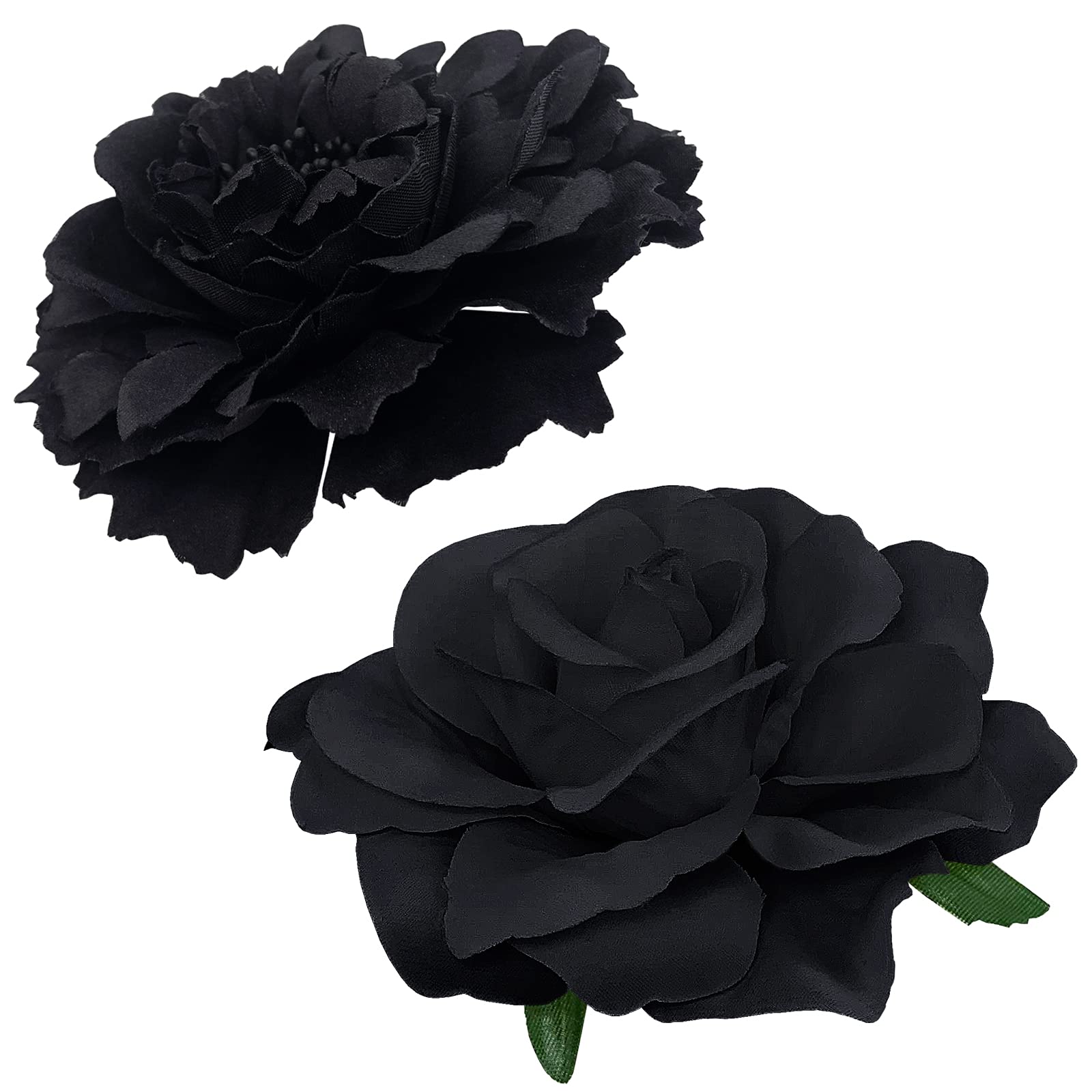 Large Floral Hair Accessory Set - Includes 4 Peony and 4 Rose Barrette Hair Clips for Flamenco Dance, Beach Party, Wedding (Black)