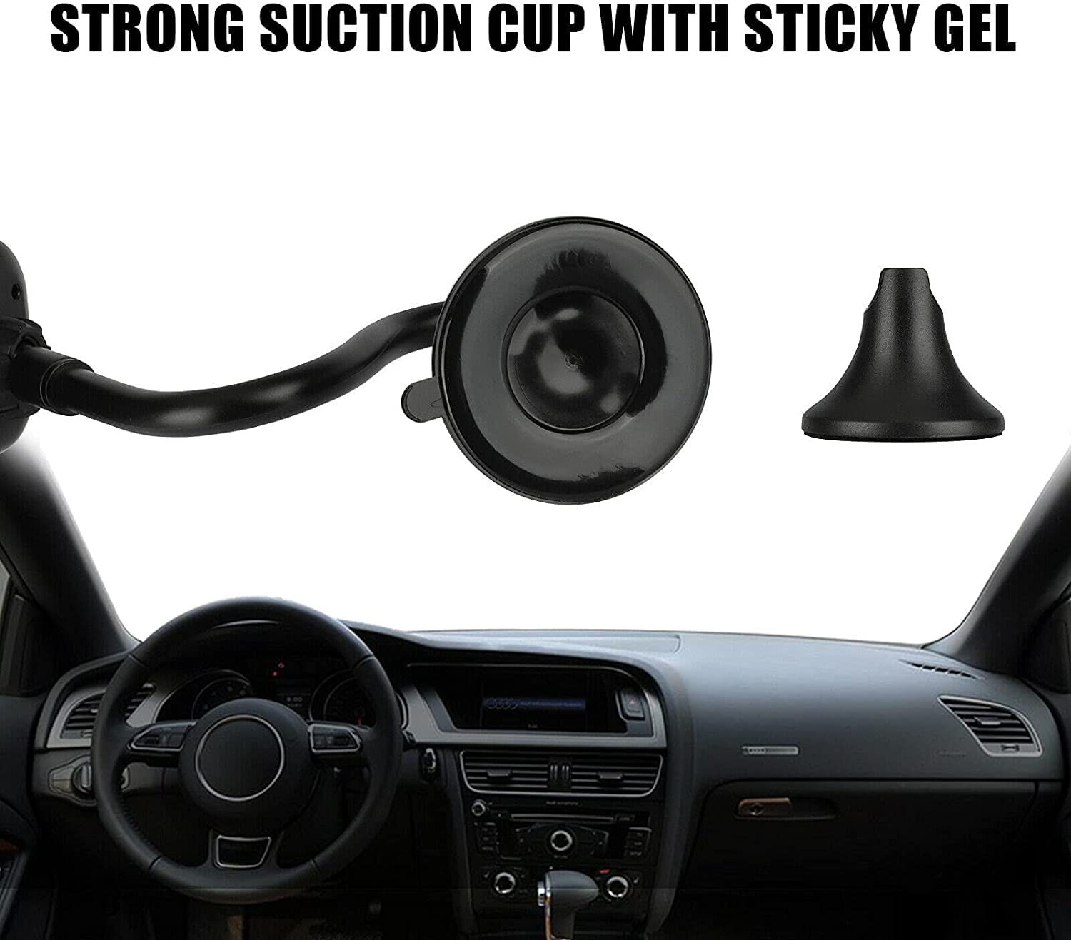 Super-strong vacuum suction cup features a layer of sticky gel and a locking lever which can maximize the stability and keep the mount in place. Comes with a stabilizer (The stabilizer only plays a role of auxiliary stabilization because Without glue). The suction cup is reusable and washable, simply rinse in water and let air dry to restore the stickiness.