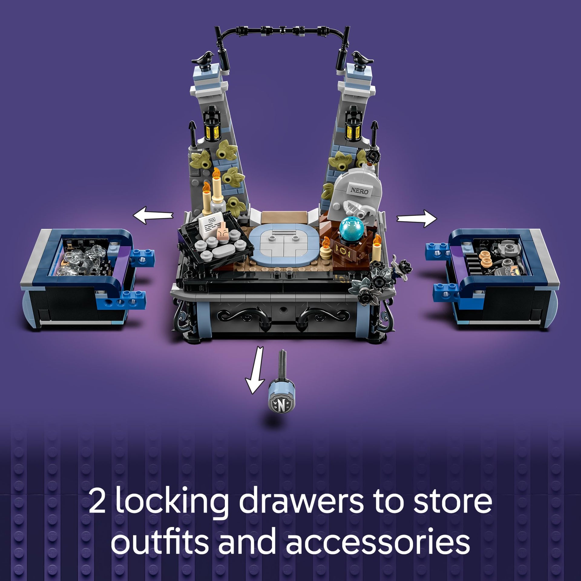 - MYSTERY PLAYSET WITH SECRET ACCESSORIES – Includes a brick-built figure of Wednesday with 2 face and outfit options, Thing character, a stand with 2 secret lockable drawers and various accessories