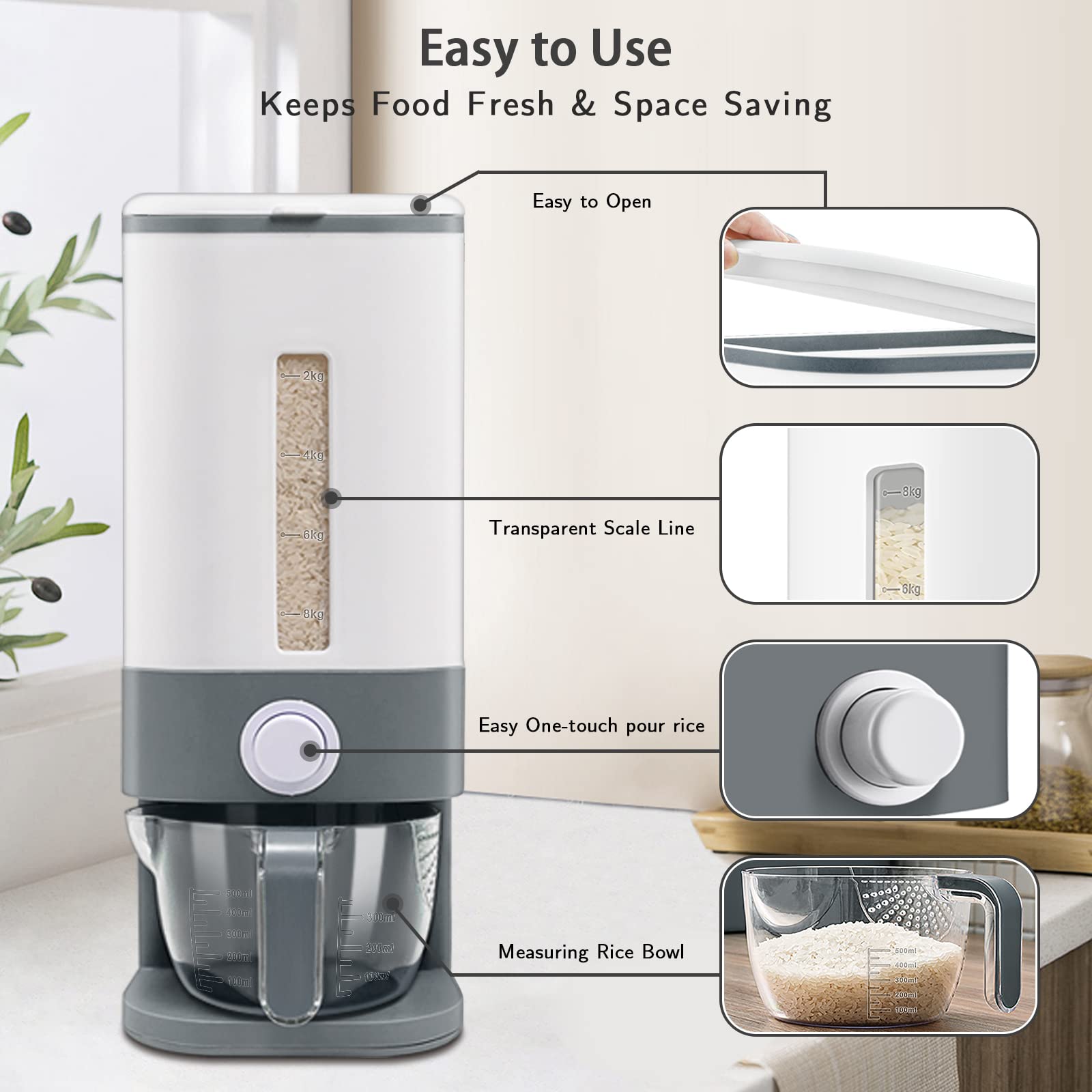 Lenwi 22-25 Lbs Rice Dispenser, Large Cereal Dry Food Storage Containers with Measuring Cup,BPA-Free Household for Kitchen Pantry Organization-Grey