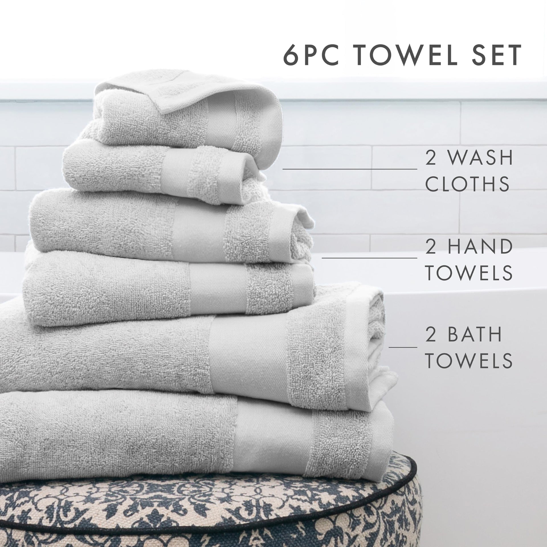 • LUXURIOUS: Our luxurious 6-piece towels set are the perfect addition to your bathroom. Including 2 bath towels, 2 hand towels, 2 washcloths, and made of 100% cotton, you get the richness of hotel quality in your very own home.