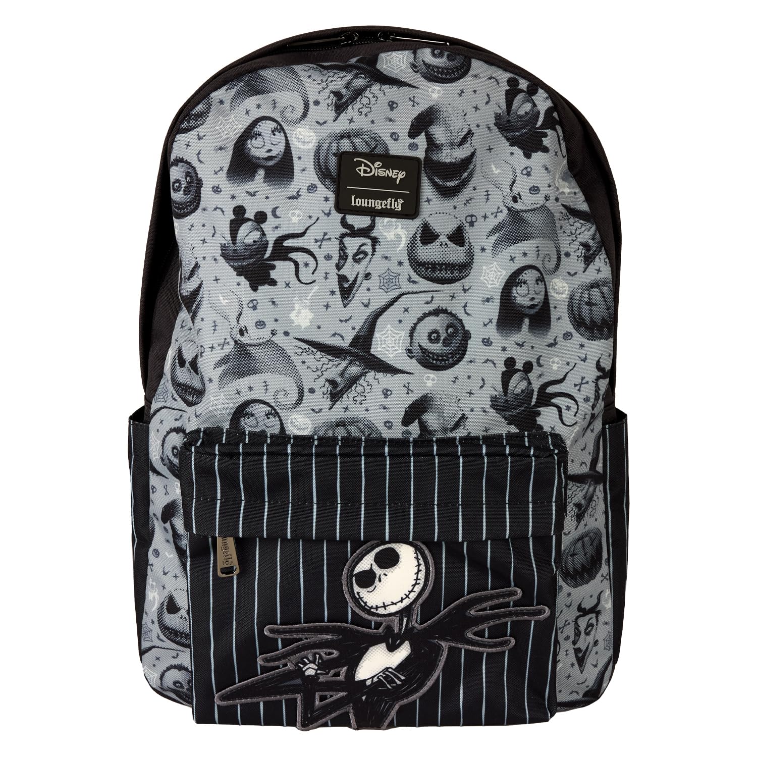 How about a little Halloween Town flair? This full-size backpack pays tribute to everyone's favorite Pumpkin King! You'll find Jack Skellington on the front pocket against a black-and-white striped background. The front of the bag is covered with images of your favorite Halloween Town characters, including Jack, Sally, Oogie Boogie, and more. Show off one of your favorite movies every day with this full-size bag!