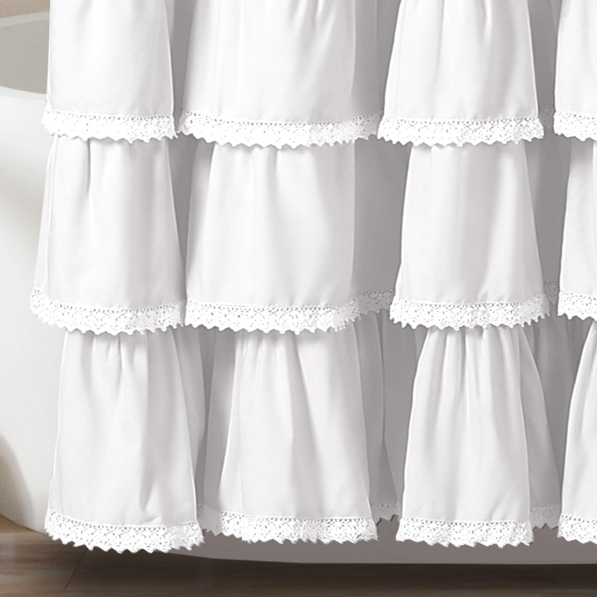 • Delicate, elegant shower curtain with textured, ruffled layers and lace detail at the bottom.