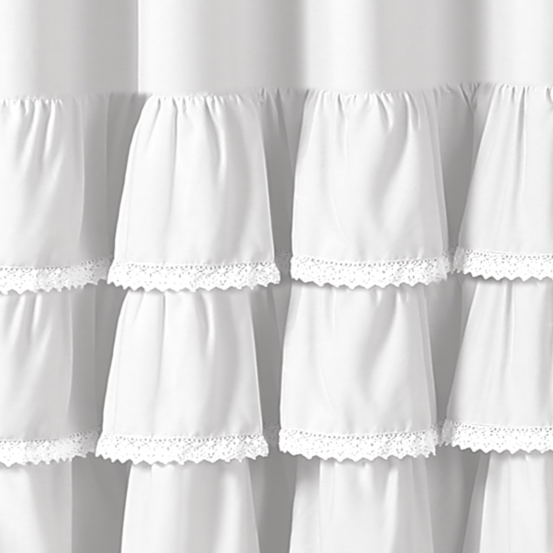 Quickly transform your bathroom into your own personal sanctuary with this stunning shower curtain. The lower part of the shower curtain features layers of ruffles with lace borders, giving this shower curtain a look that creates a Spa-like atmosphere.