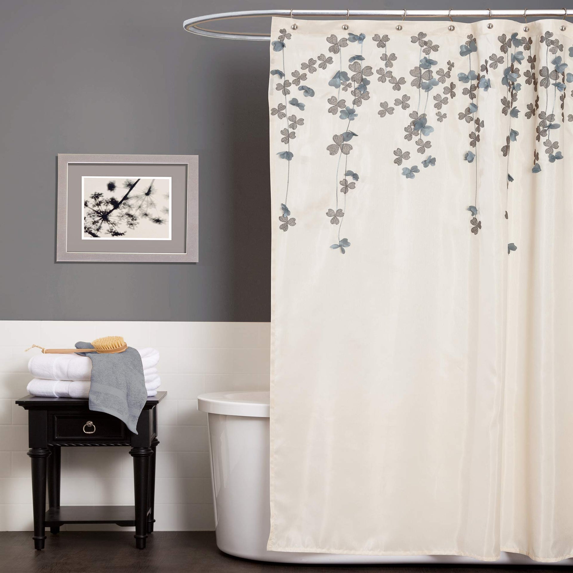 • Calming, decorative design with cascading blue flowers against a ivory panel for a charming bathroom shower curtain.