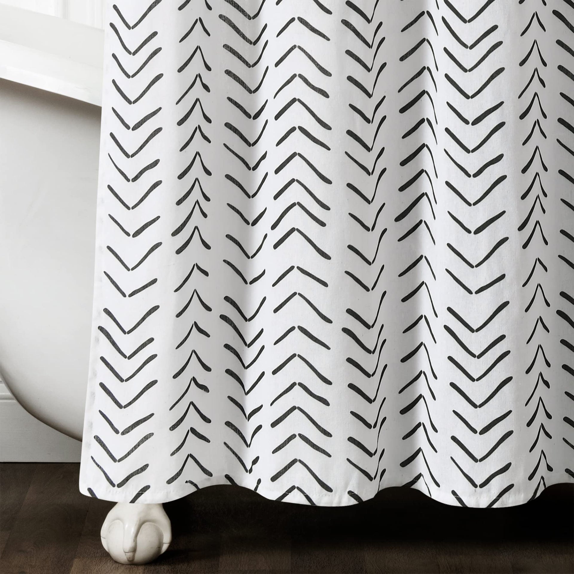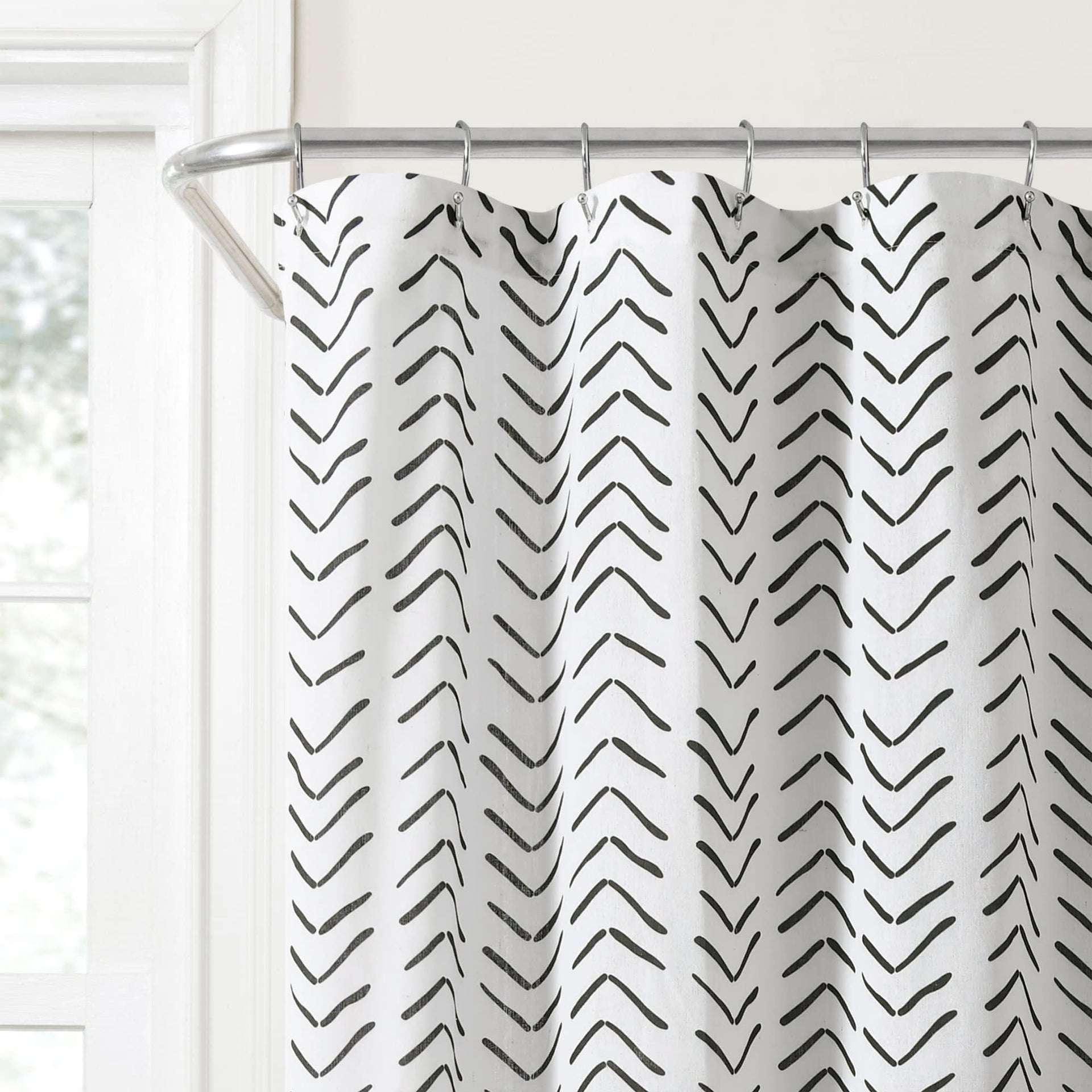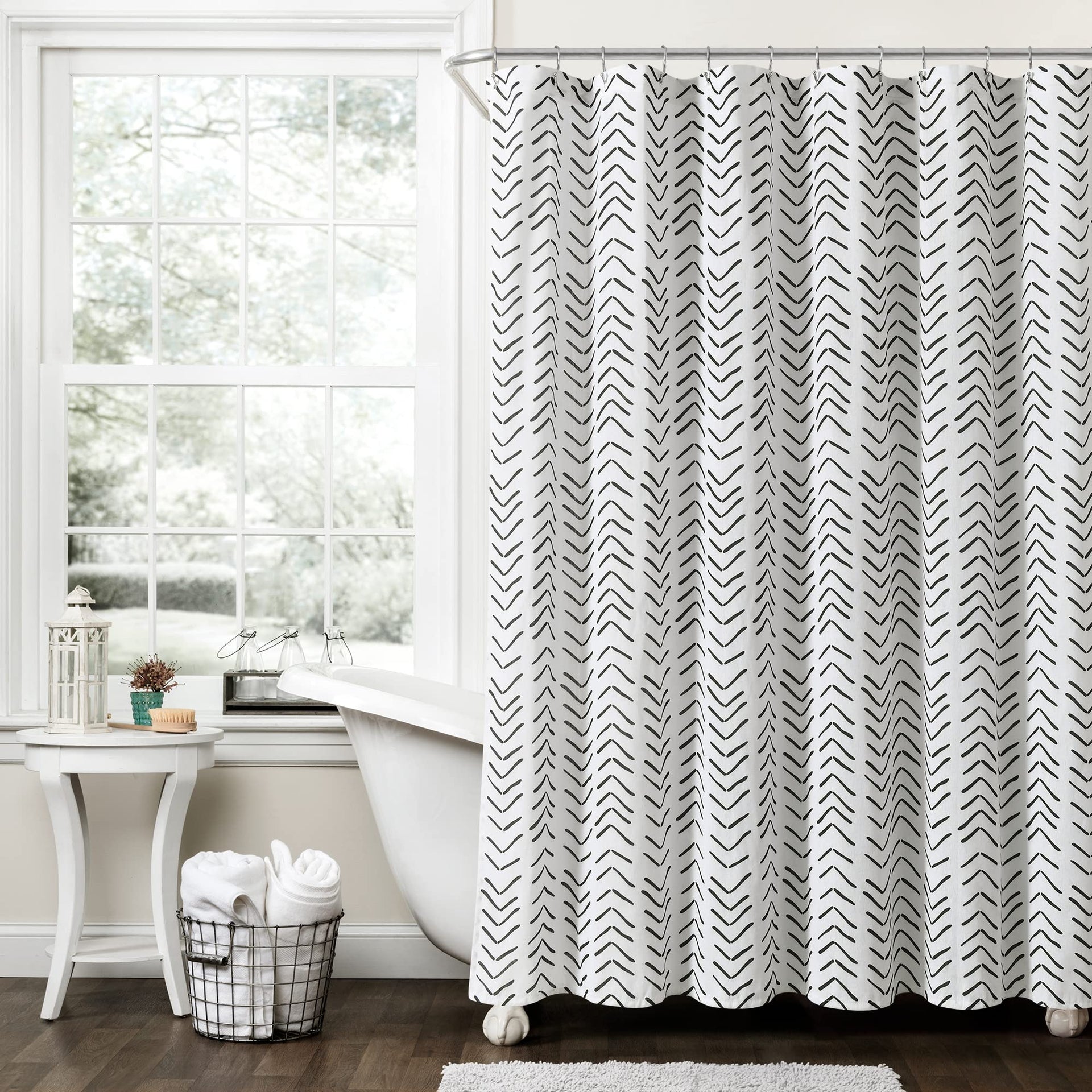 • The white and contrasting color scheme is also super versatile and can easily be styled into your space. The cotton blend is soft with a luxurious linen look. This shower curtain measures 72 inches along each side and should fit most standard bathtubs.