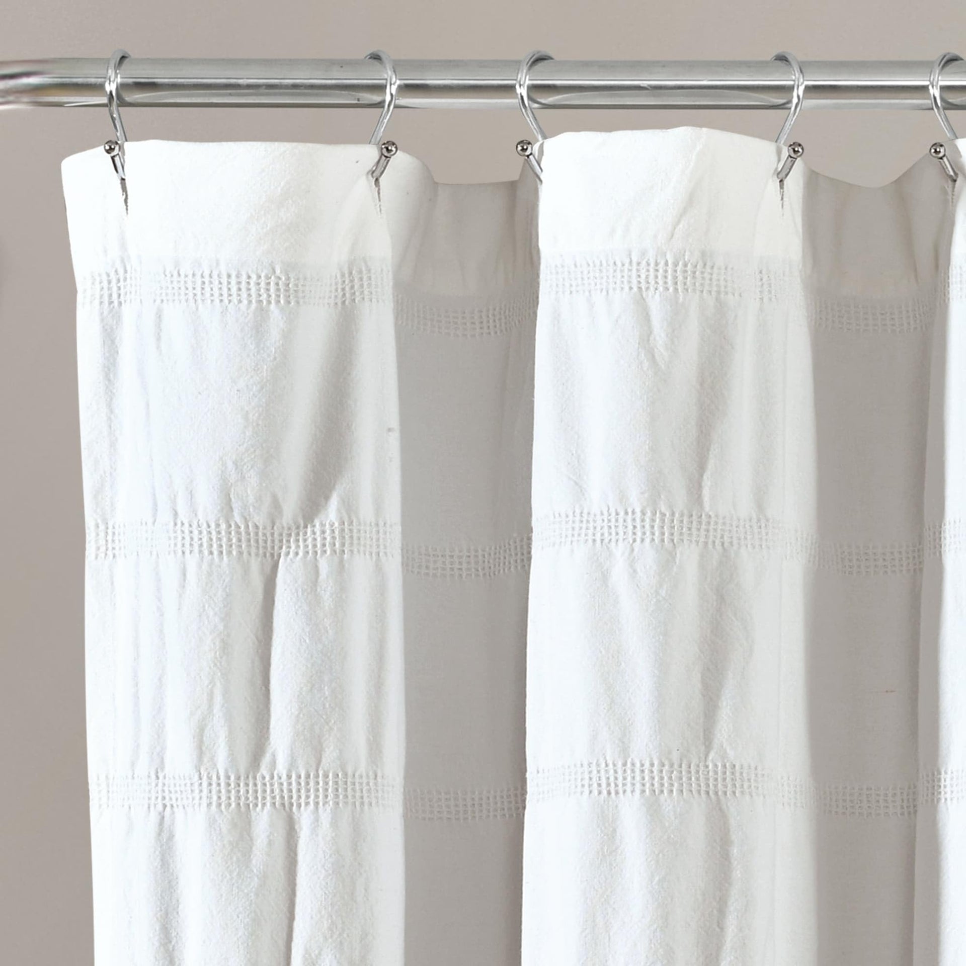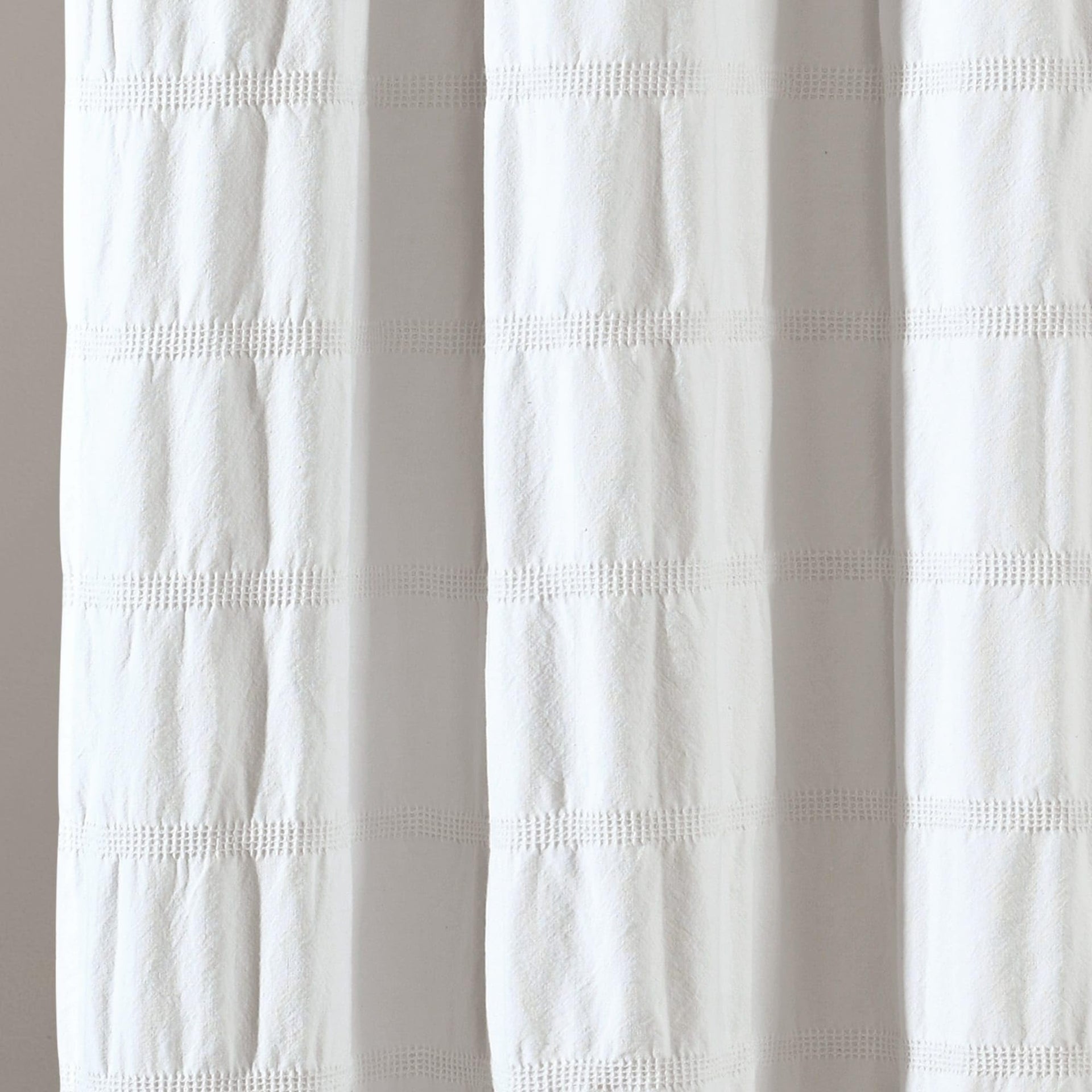 Add a touch of luxury to your bathroom with our Waffle Stripe Woven Shower Curtain. This stylish new shower curtain adds a bold texture to your master bathroom or guest bathroom. The horizontal waffle-striped design and durable, textured white fabric of this modern shower curtain make a nice neutral backdrop that will complement any style of decor or bathtub. Because these fabric curtains are made of 100% cotton, they are extremely durable and can even be cleaned. We recommend cleaning your cloth shower curtain by washing in cold water. Hang the curtain to air dry to maintain the look and feel of these luxurious curtains. Use only non-chlorine bleach as needed. Plus, linen fabrics breathe well and dry quickly.Each curtain measures 72" H x 72" W, so they're wide and tall enough for a standard shower or bathtub. The white color blends into your space without being overwhelming. The color and design can coordinate with any bathroom design style, including minimalist, traditional, modern, or rustic farmhouse styles. The elegant cloth curtain features a row of small holes at the top to accommodate the shower rings or hooks of your choosing. At Lush Decor, we offer a range of home products that are luxurious yet affordable. All of our products are made by a team of in-house designers who aim to create items that are functional, fashionable, and unique. Shop our line of home accessories, ranging from curtains to bedding.