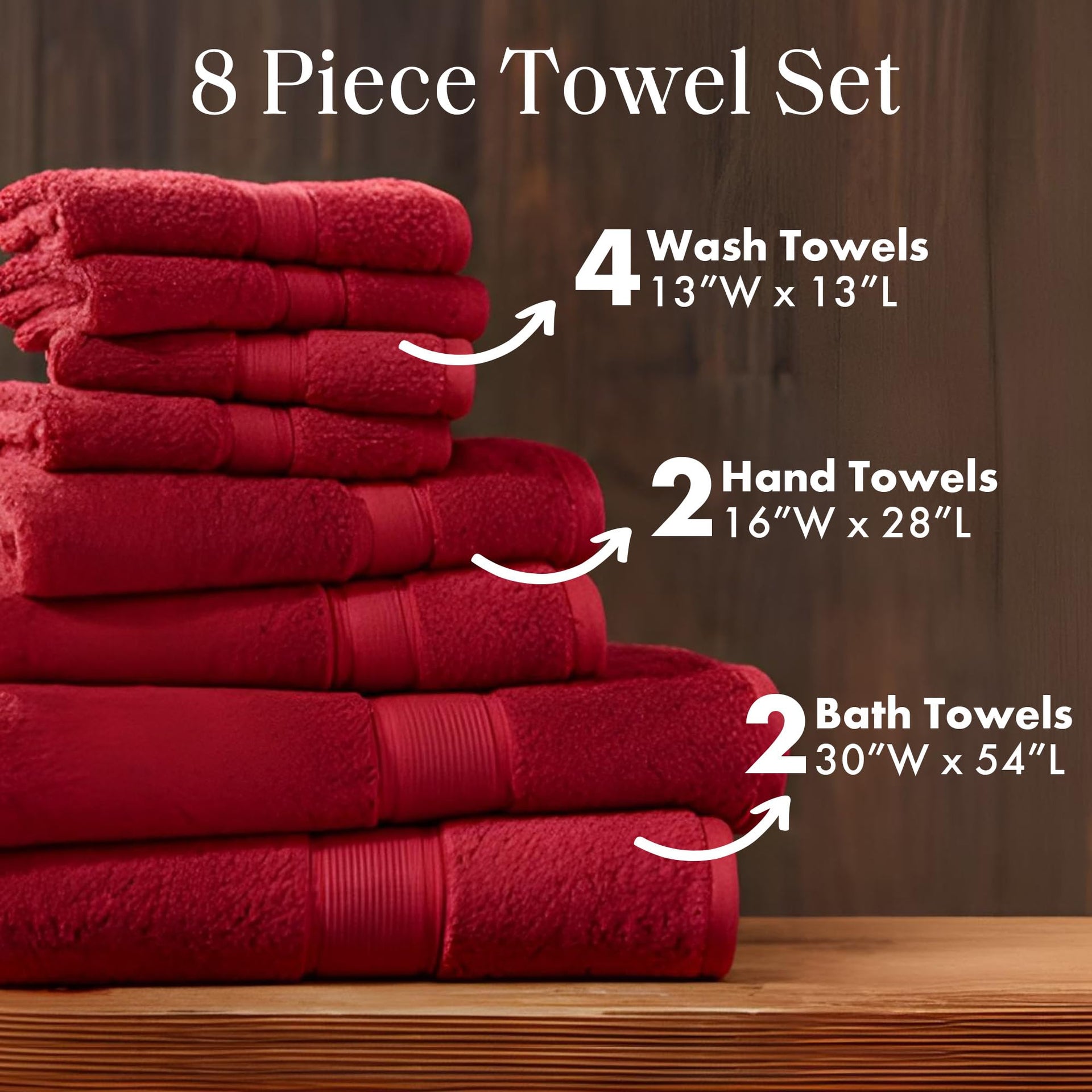 • COMPLETE 8-PIECE BATH SET: Includes 2 bath towels (30"x54"), 2 hand towels (16"x28"), and 4 washcloths (13"x13") for a complete bathroom solution