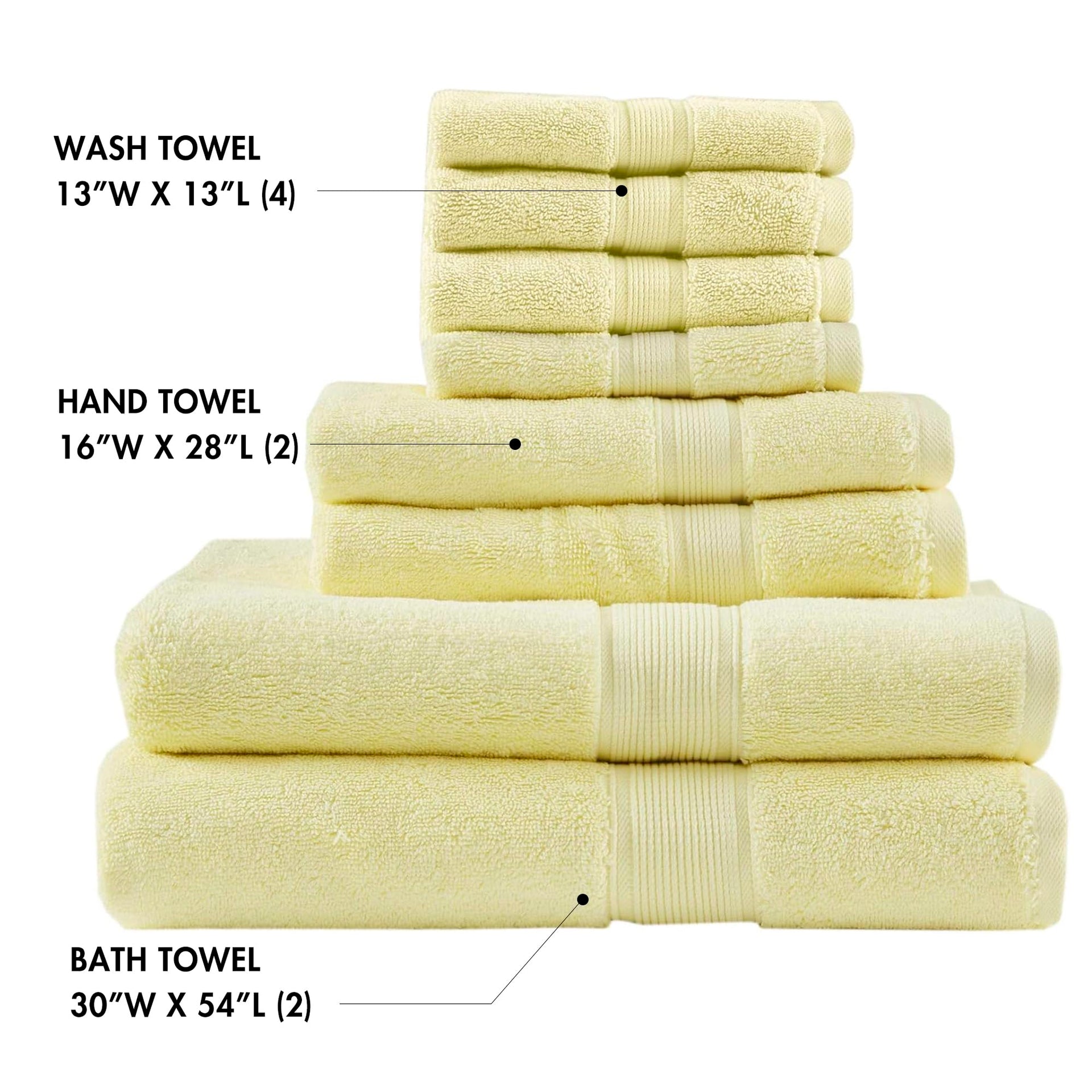 • COMPLETE 8-PIECE BATH SET: Includes 2 bath towels (30"x54"), 2 hand towels (16"x28"), and 4 washcloths (13"x13") for a complete bathroom solution