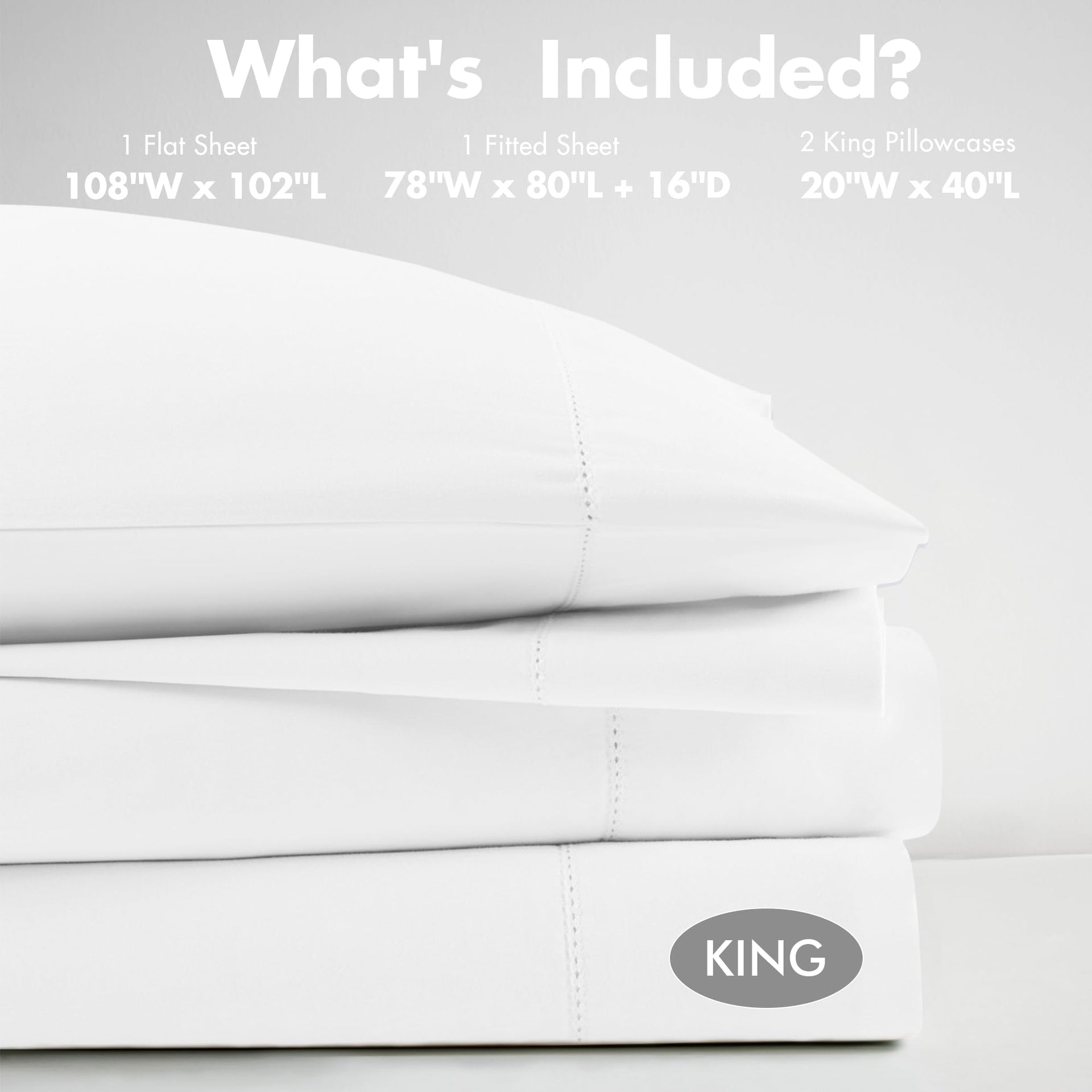 - Set include: 1 Flat Sheet: 108"W x 102"L, 2 King Pillowcases: 20"W x 40"L, 1 Fitted Sheet: 78"W x 80"L + 16"D