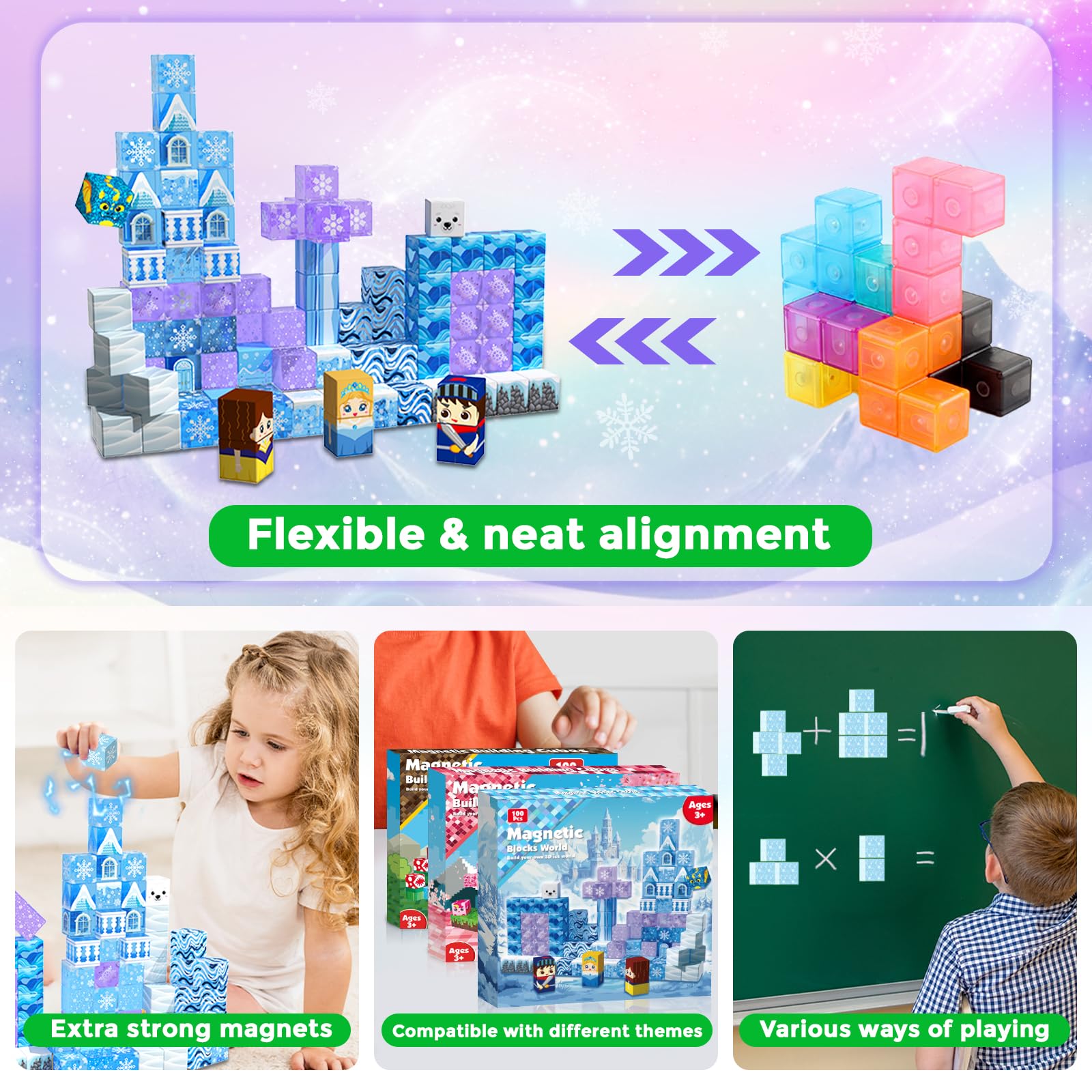 - 👑【Safe, Durable, Compatible Magnetic Blocks】 Made with non-toxic materials and smooth edges, these washable, safety-certified magnetic cubes are built to last. Each block measures 0.8 inches, making them the perfect size for little hands to grasp and connect. Seamlessly connect with other magnetic tile sets to build expansive snowy scenes, or entirely new worlds. Perfect for kid ages 3 4 5 6 7 8 9 10 11 12 years old.