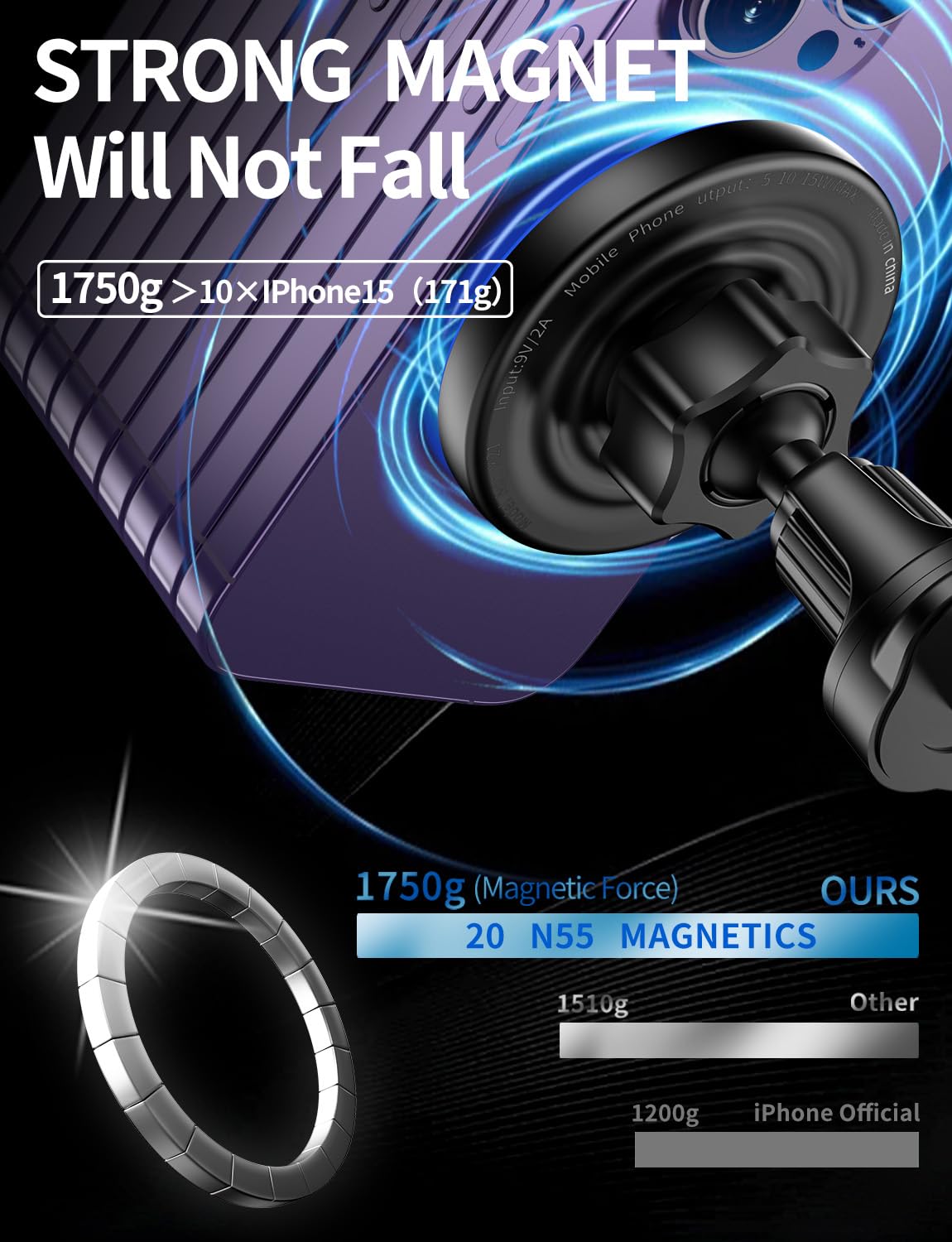 • 【Upgraded Magnetic Power】Experience a secure and reliable magnetic connection that firmly locks your phone in place, ensuring it stays steady even on bumpy roads. With its strong hold, you can enjoy hassle-free charging and worry-free driving without any interruptions or the risk of your phone slipping