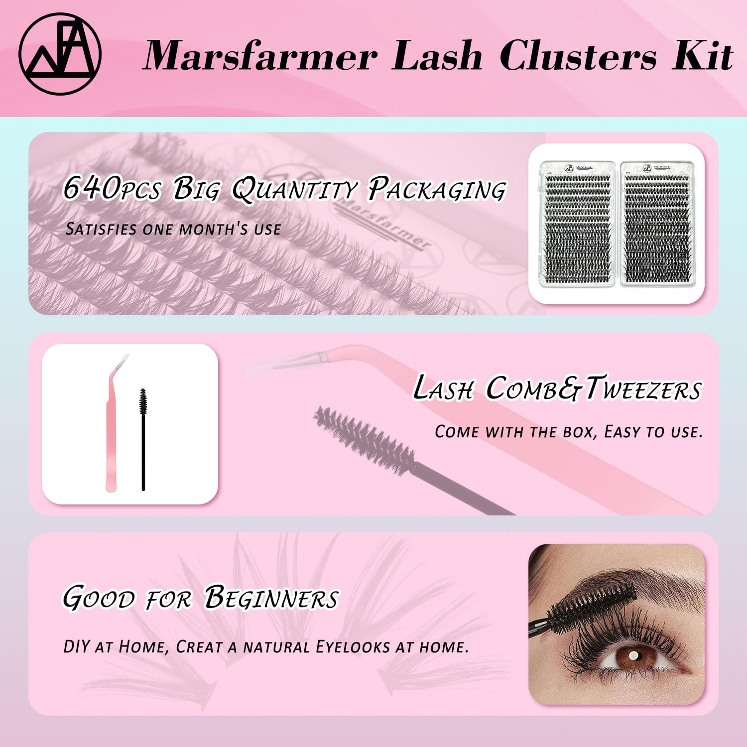 Marsfarmer 640pcs Lash Clusters Kit - 9-16mm 40D+50D D Curl Individual Lashes Clusters, DIY False Eyelashes Clusters Extension with Lash Cluster Applicator Tweezers