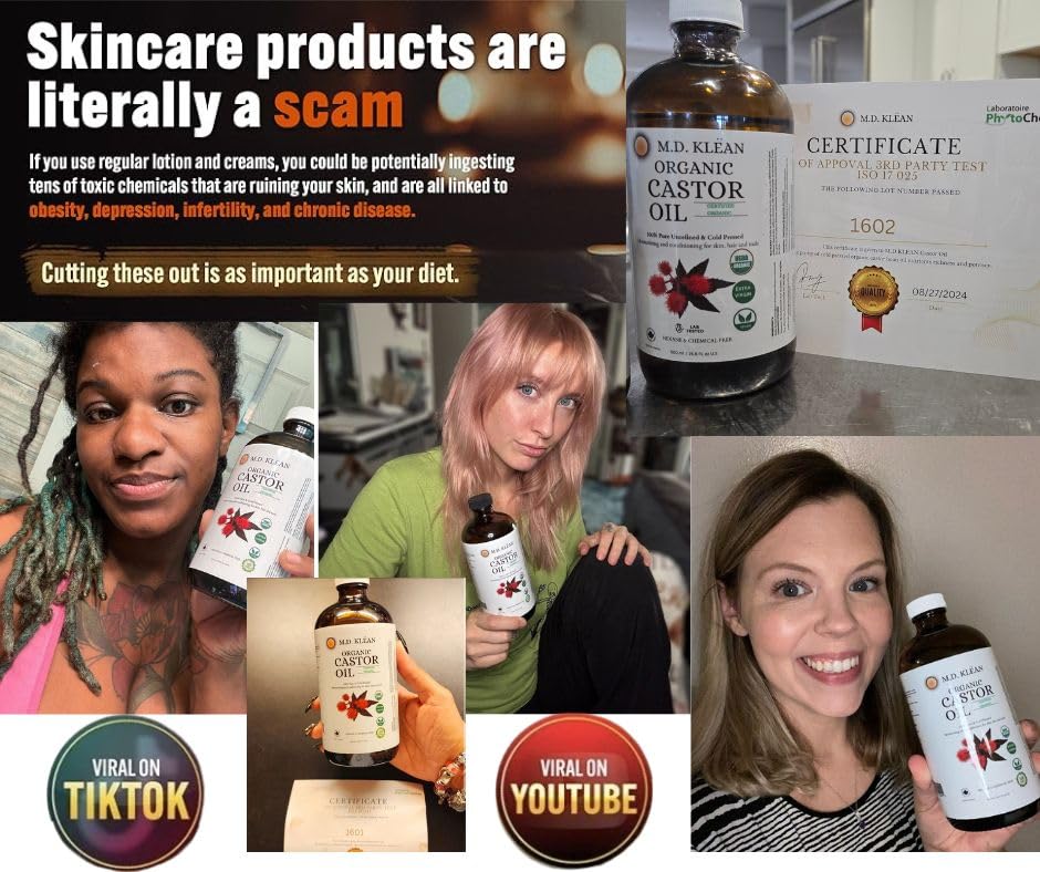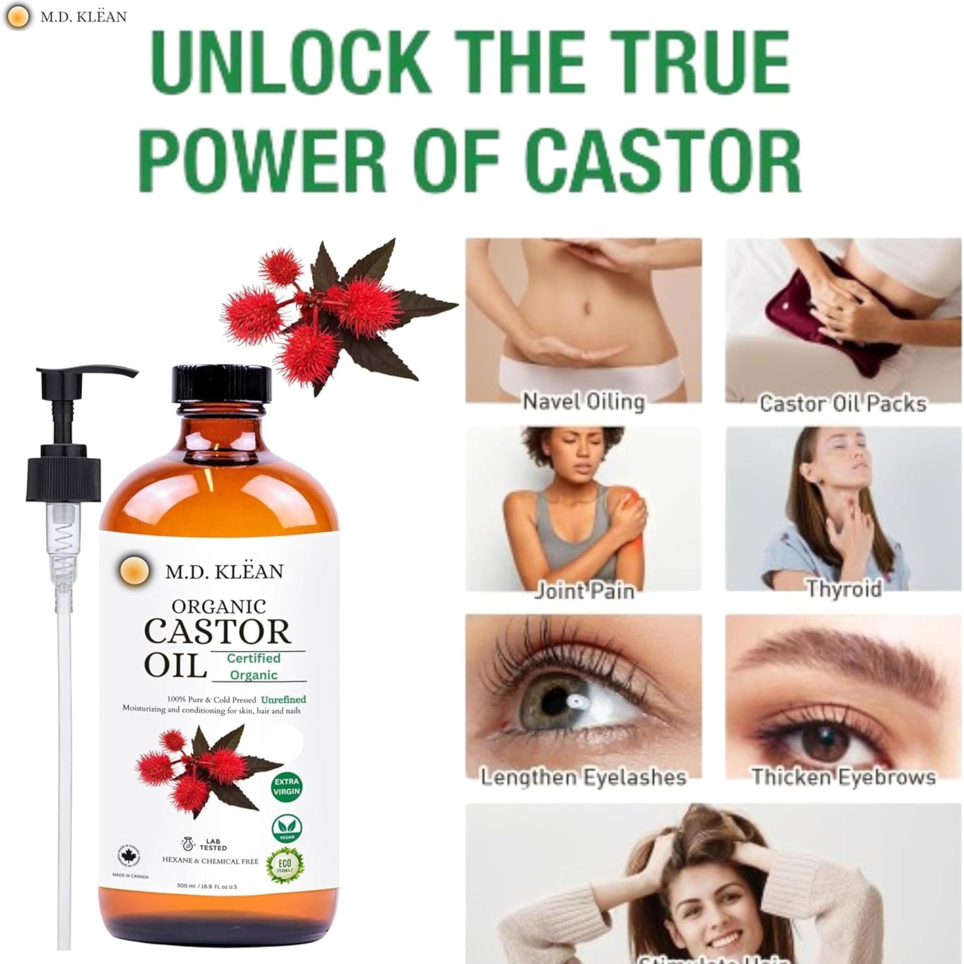 MD KLEAN Organic Castor Oil (500ml w/ 60ml Dropper) 100% Cold Pressed Unrefined Glass Bottles | Hexane Free | Moisturizer and Conditionor