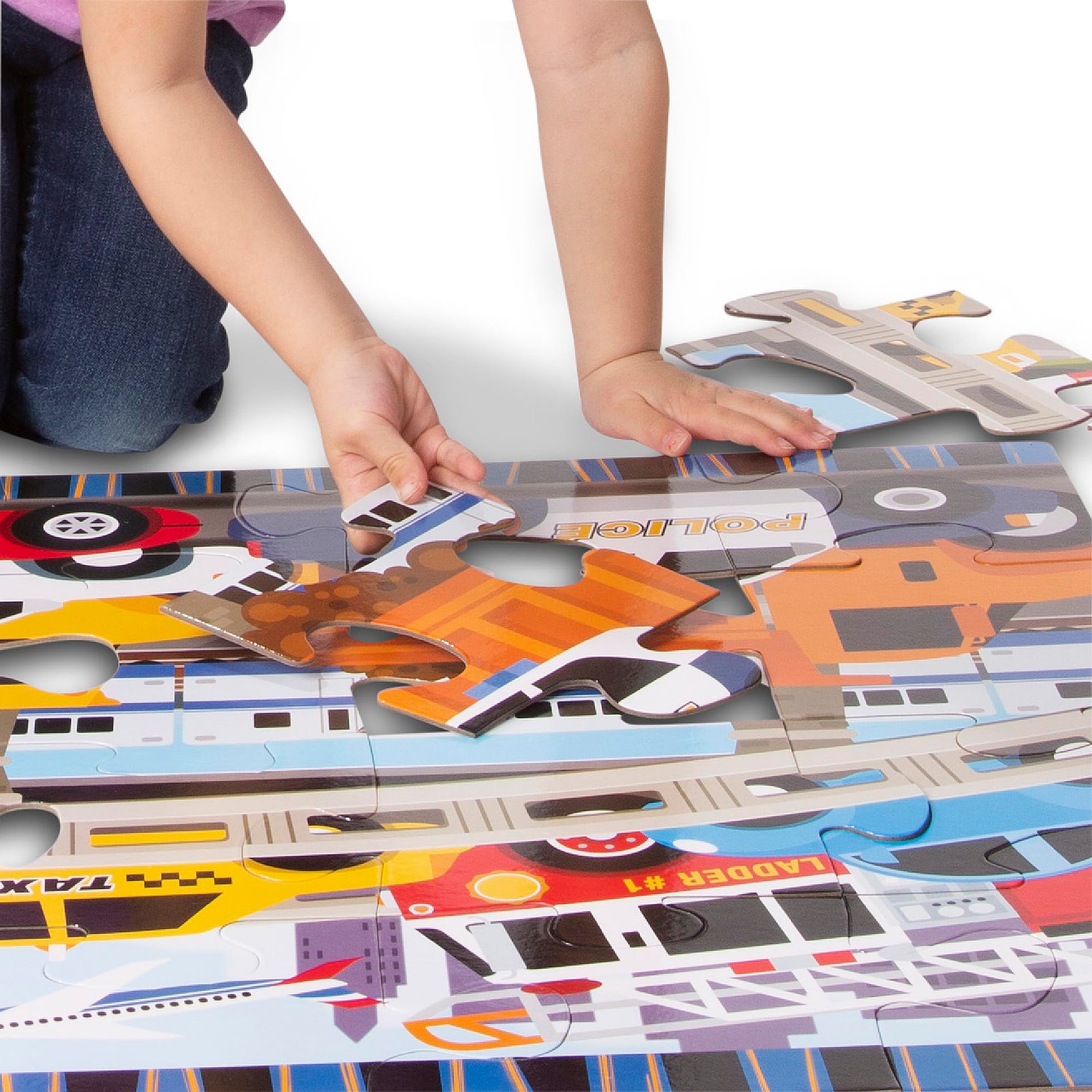 Beep beep! With so many vehicles to identify, no one would mind sitting in this traffic jam! This large floor puzzle features brightly colored vehicles that kids can recognize such as a cement truck, a taxi, a police car, and even a plane and a train in this multi-vehicle scene. While playing with this Traffic Jam Puzzle, kids ages three and older can practice shape recognition, hand-eye coordination, and problem-solving skills. And they'll have loads of fun while doing it! They might recognize some of their favorite vehicles that can inspire them for storytelling and other imaginative play. The puzzle includes 24 jumbo pieces made out of durable, extra-thick cardboard. Once the puzzle is completed and set up, it measures 36 inches x 24 inches fully assembled. Don't worry about your kids playing with the floor puzzle over and over again…the puzzle pieces are not just durable, they're made with an easy to clean surface that helps to keep it looking like new. The Traffic Jam Floor Puzzle makes an exceptional birthday gift or holiday gift for kids ages three and older. This product is certified by the Forest Stewardship Council. FSC certification ensures that products come from responsibly managed forests that provide environmental, social, and economic benefits, and that forests are protected for future generations. Please note that FSC certification applies to new inventory only (FSC C156584)