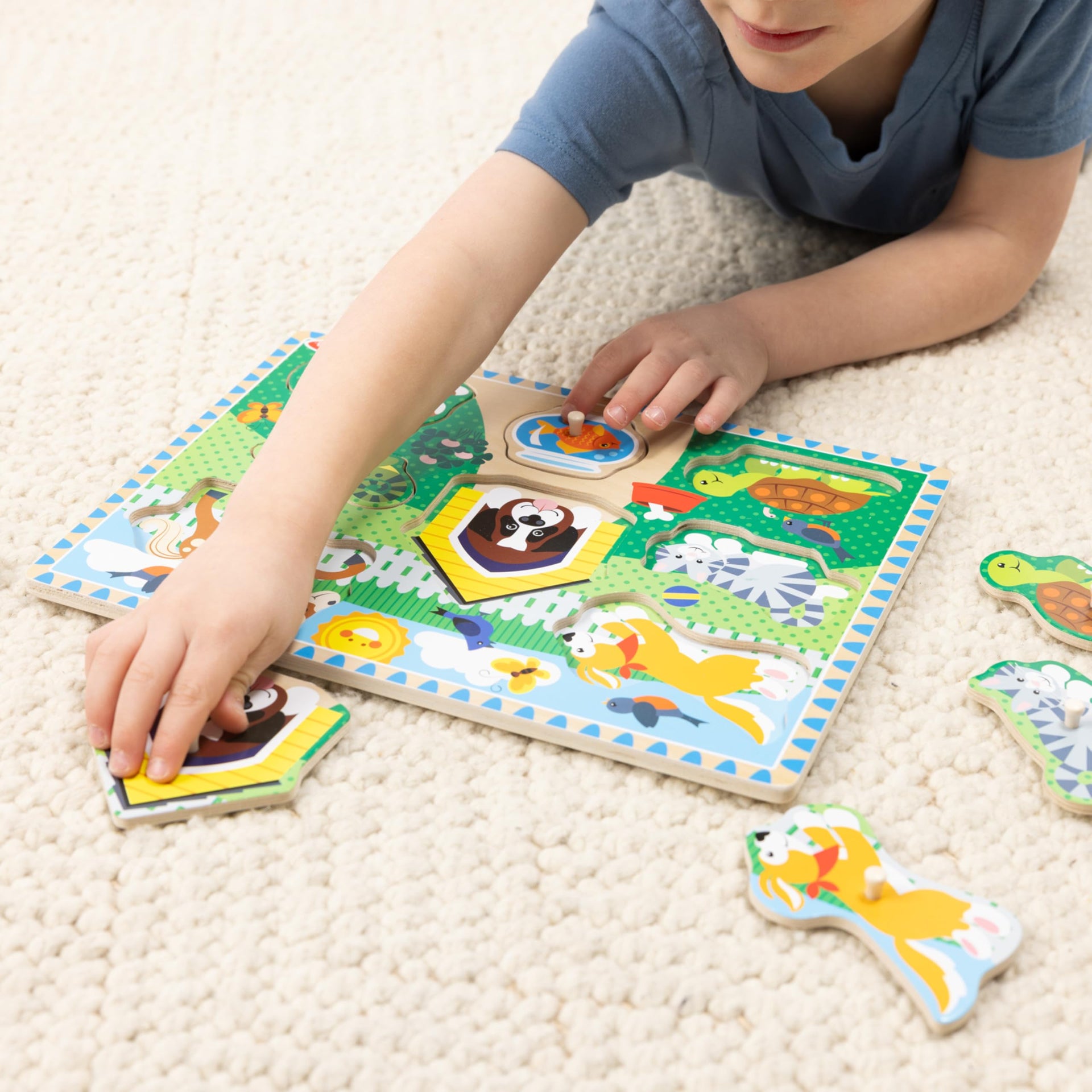 Details: Grab on to this exciting assortment of early-learning, super fun wooden peg puzzles. The set of four includes Farm, Pets, Safari, and Vehicles. Easy-grasp pegs and pictures under the sturdy wooden pieces help kids solve these simple seven- or eight-piece puzzles, which are a great way to practice hand-eye, fine-motor, and memory skills.