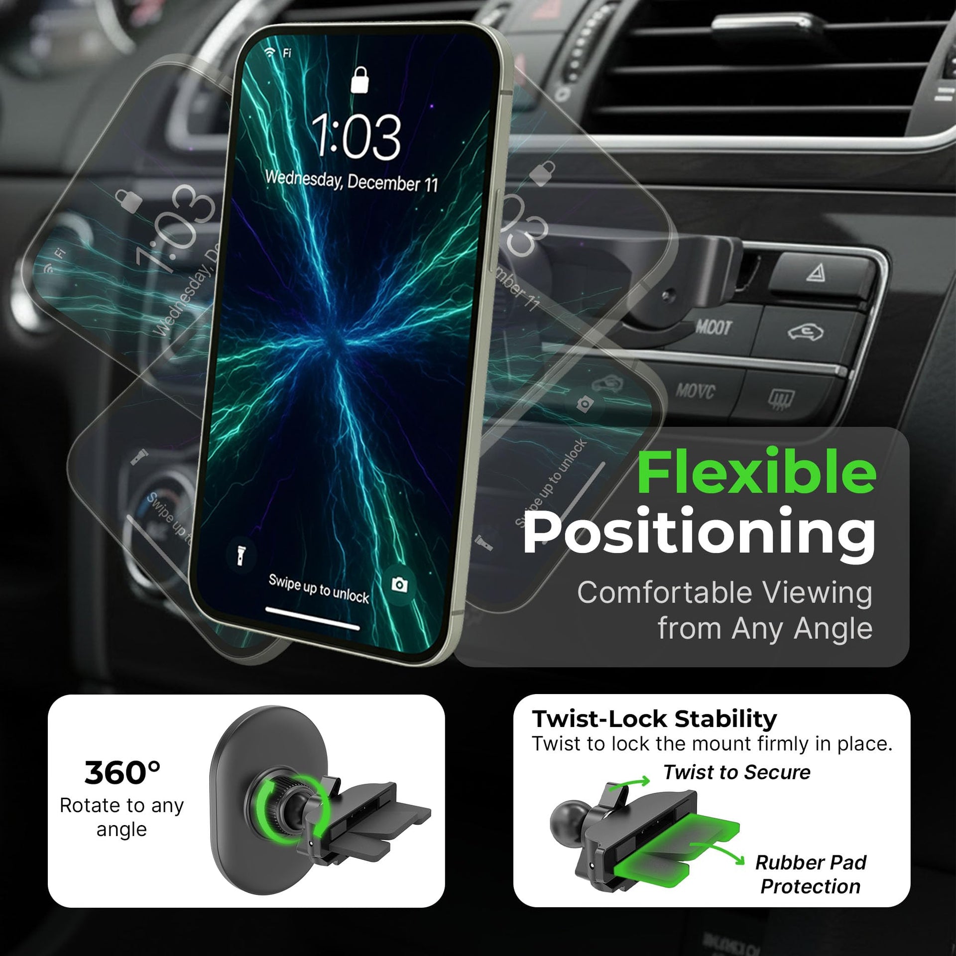 • What's Inside The Box: MagSafe Magnetic Car Mount, CD slot mounting base, alcohol cleaning pad, and step-by-step user manual. Compatible with iPhone 12-17 and Galaxy S24 Ultra (with a MagSafe-compatible case or ring), this car mount provides a secure, accessible option for nearly every driver and device.