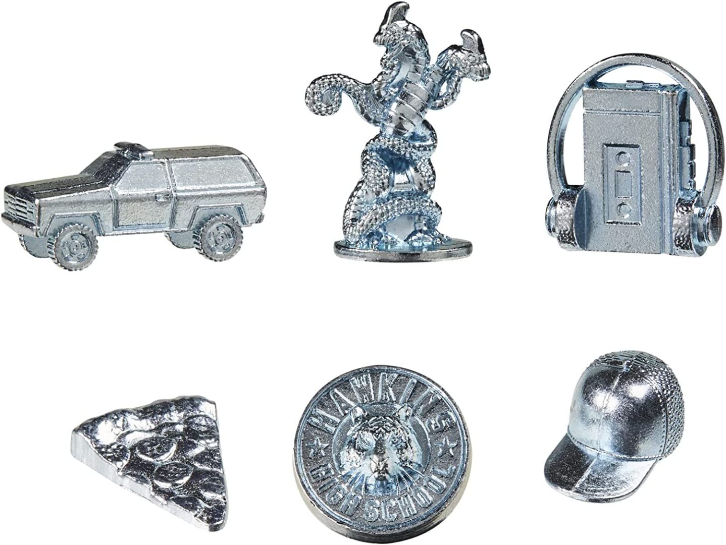 • THEMED MONOPOLY TOKENS: The tokens are iconic symbols from the show such as Hopper's police truck, a Demogorgon, Hawkins High School crest, a slice of Surfer Boy pizza, and Dustin's baseball cap