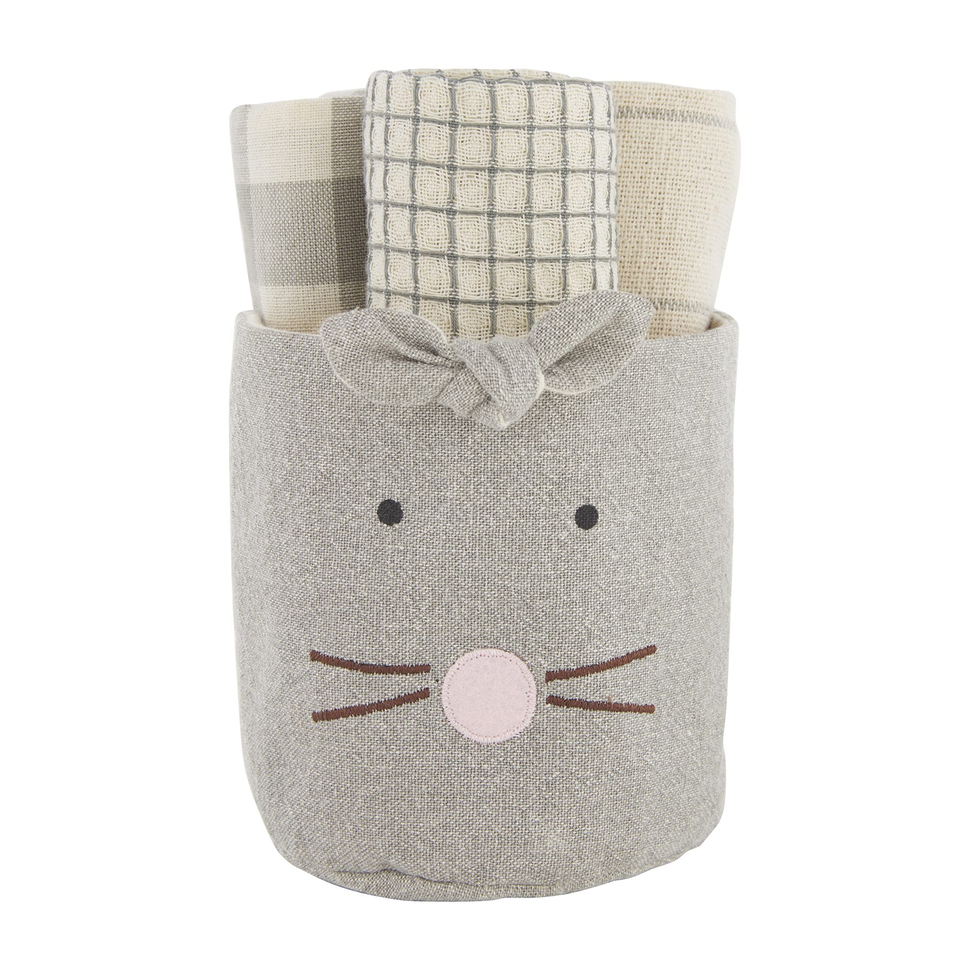 4-piece set. Three cotton dish towels come rolled in canvas bunny bucket.