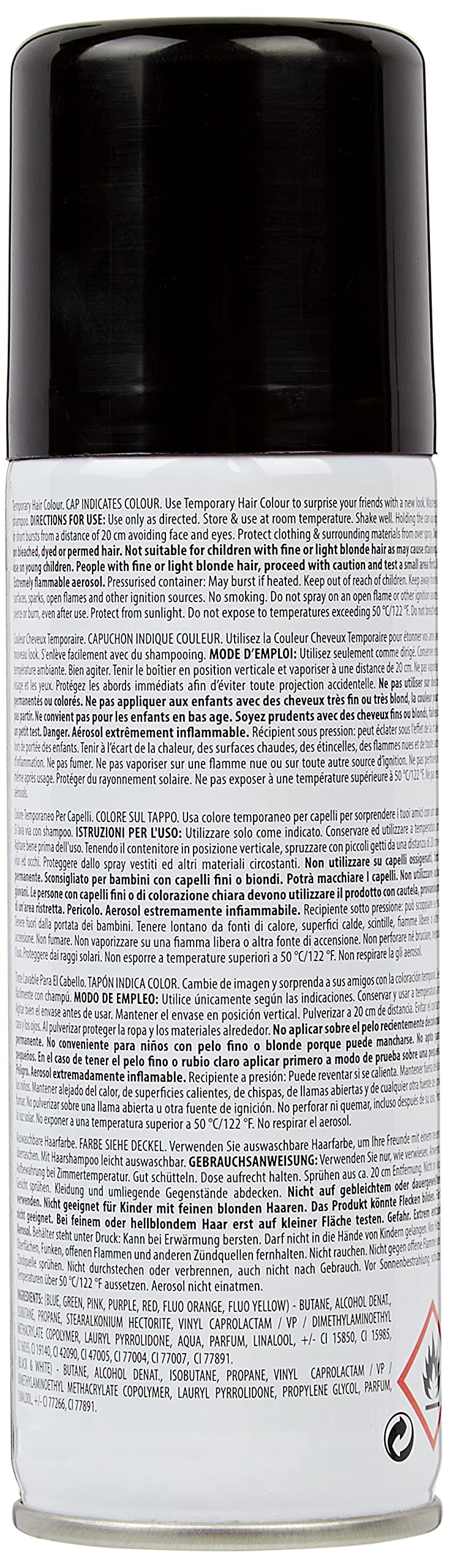 Take any Halloween hairstyle to the next level with this bold Black Hair Spray. This hair coloring spray is a quick and easy way to give locks a temporary paint job for a costume party, football tailgate party, or pep rally. Apply a few streaks or cover every inch of mane, then simply wash it out afterwards with regular shampoo. For best results, be sure to shake the can for several seconds before applying and after every few sprays during application.