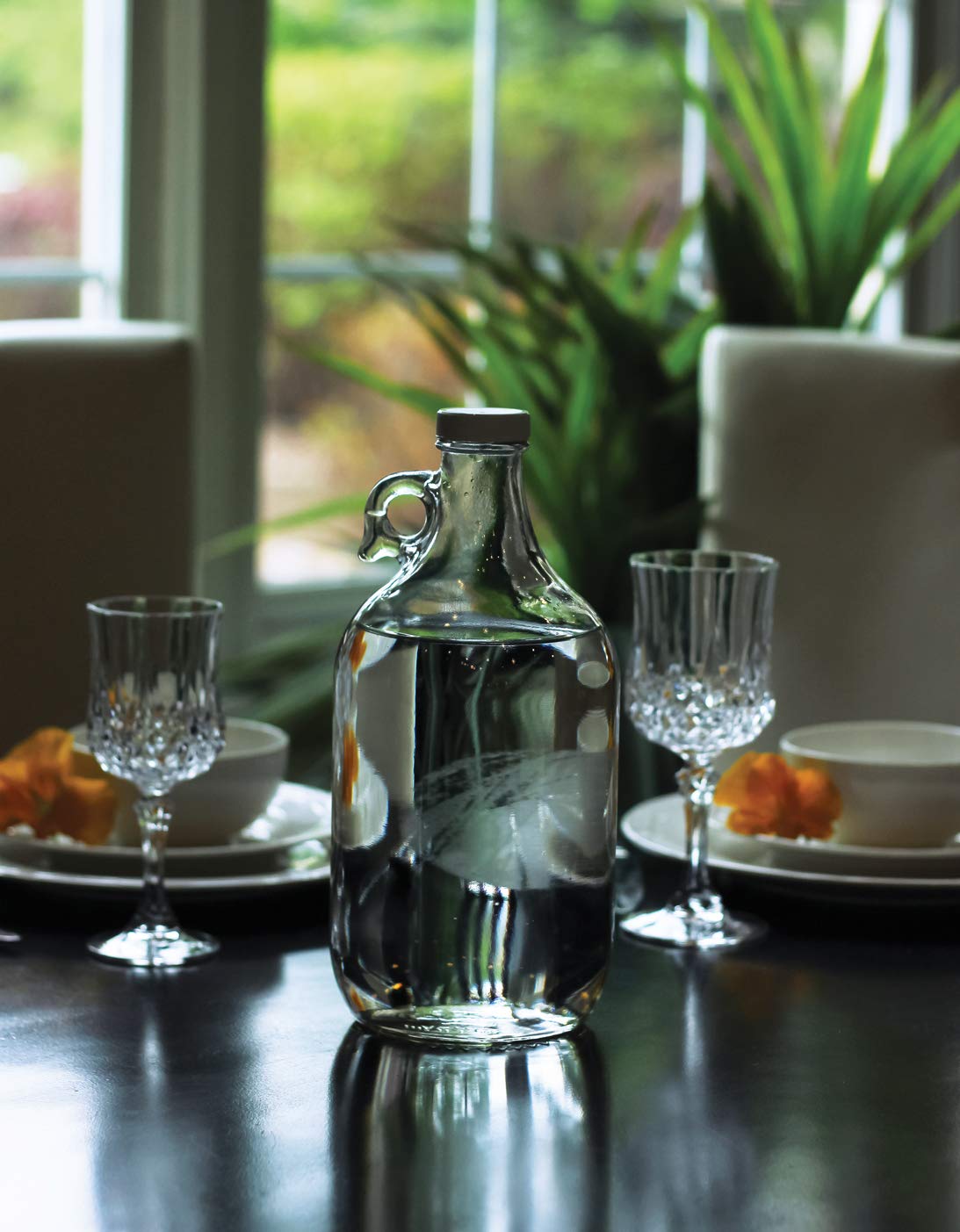 These 1 Gallon glass bottles are made in the USA. BpA free, reusable, non-leaching, non-porous. They offer an alternative to plastic and metal bottles and are ideal for storing liquids of most any kind. Traditional finger handle makes carrying and pouring easier and BpA free plastic cap ensures a tight seal. 1 Gallon - 6. 5" diameter by 11-3/4" tall.