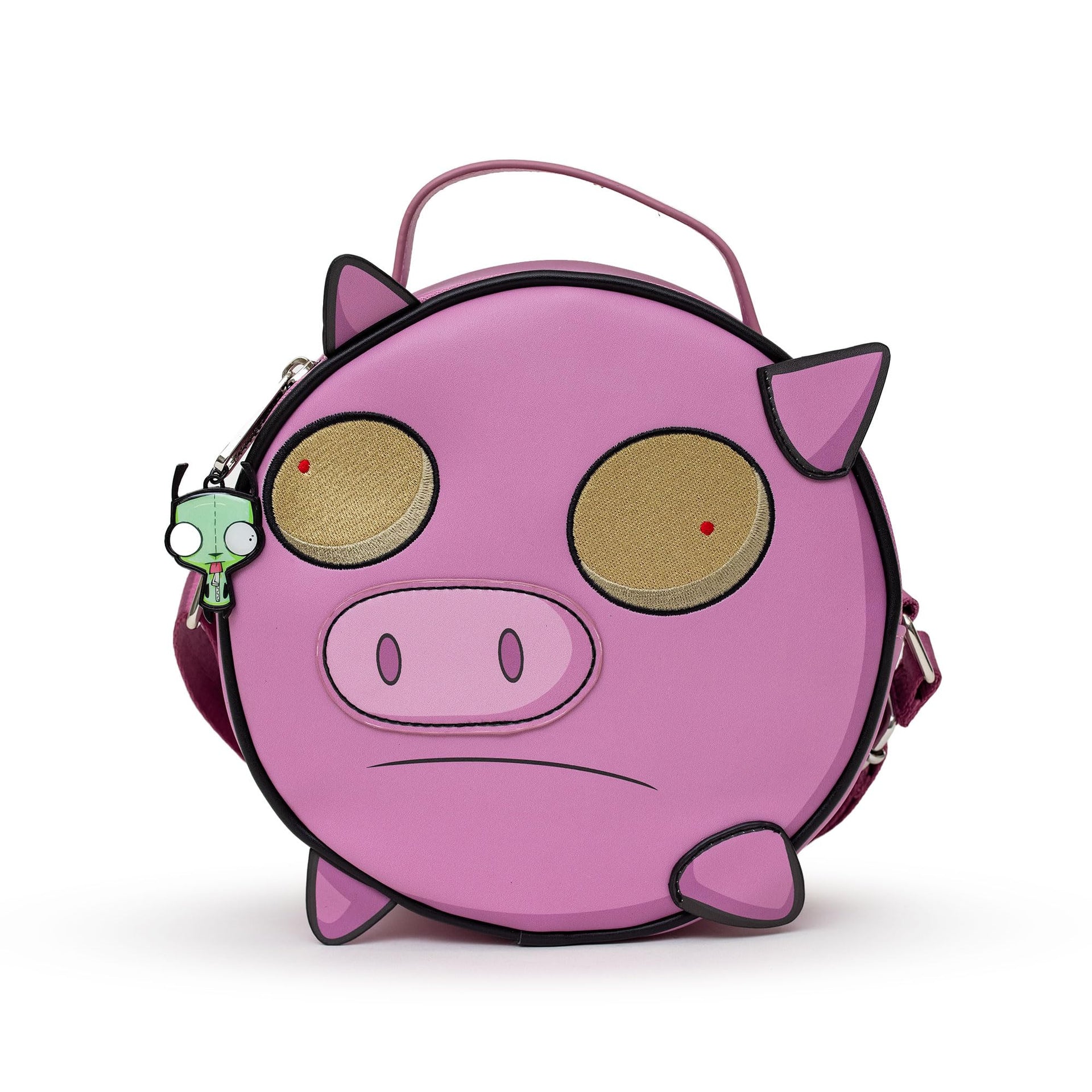 Nickelodeon Bag, Crossbody, Round, Invader Zim Piggy Close Up Applique with Embroidery, Pink, Vegan Leather