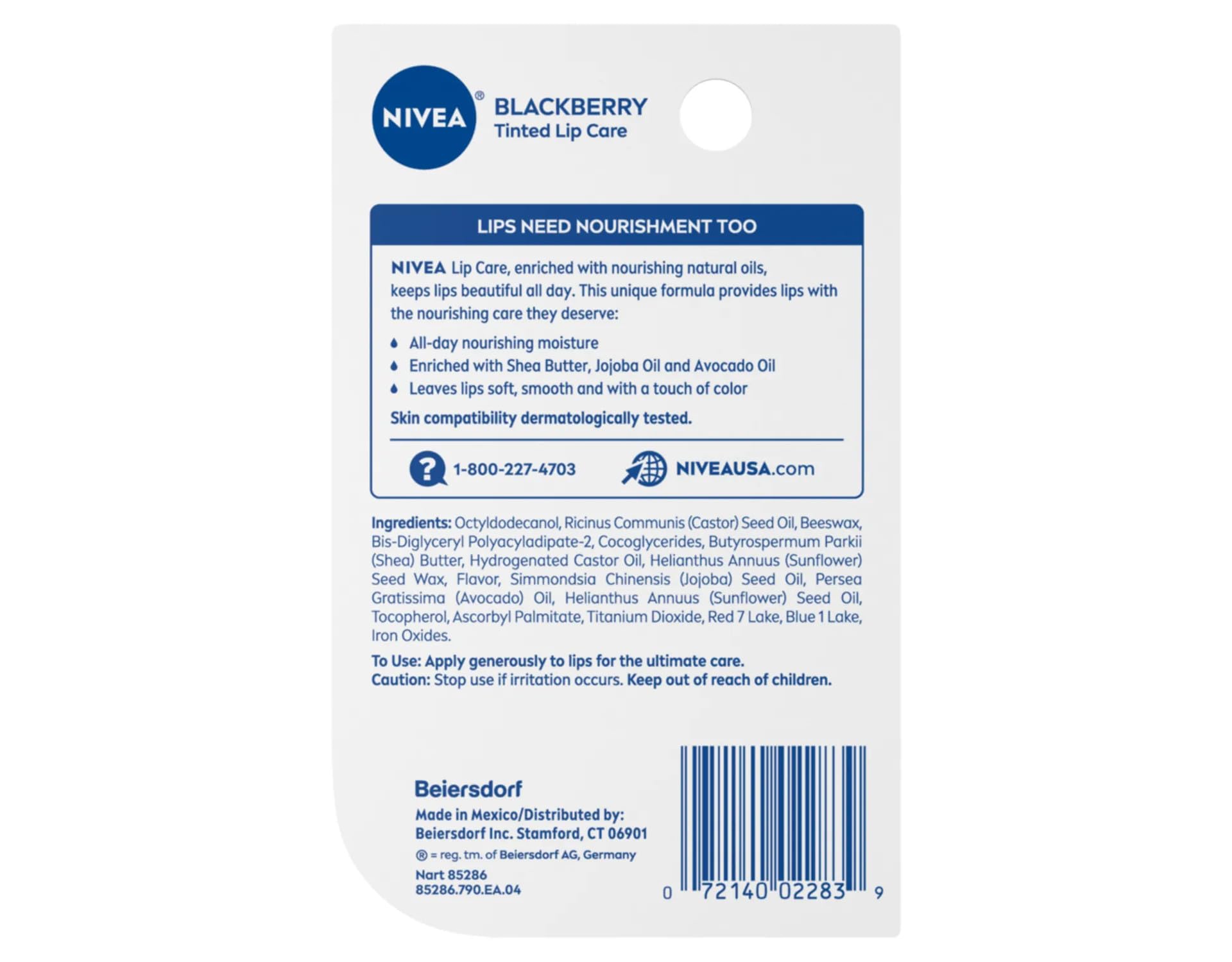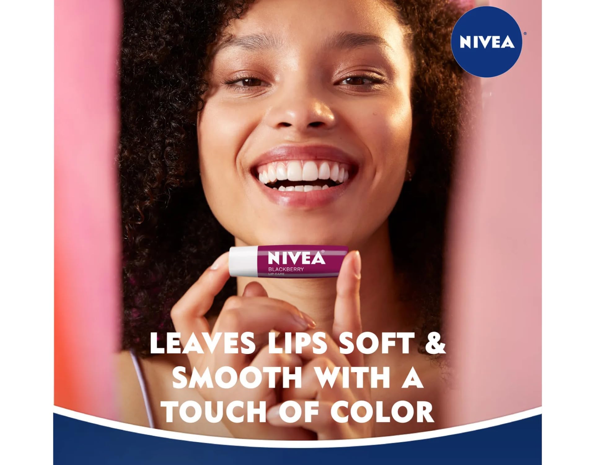 NIVEA Blackberry Lip Care, Tinted Lip Balm with Shea Butter, Nourishing Oils and Vitamin C & E, 3-in-1 Moisture, Repair (for Dry Lips) and Color, 0.17
