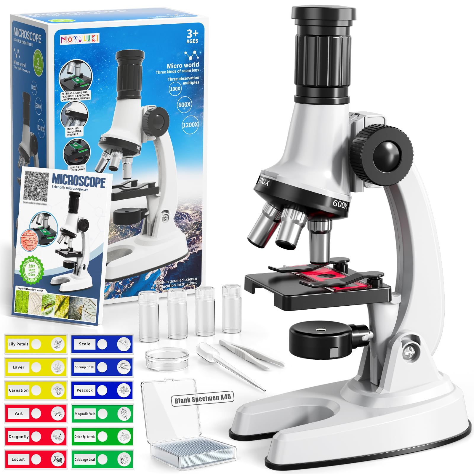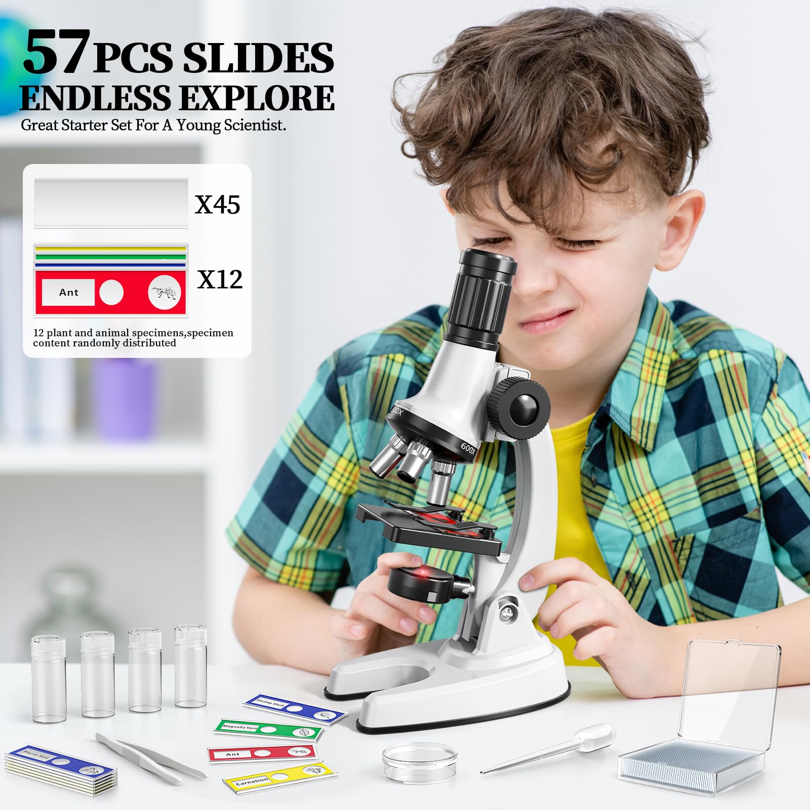 - Configuration Content: This kids microscope with 65 pieces including microscope machine, 12 randomly selected specimens, 45 blank specimens, 4 collection bottles, tweezers, dropper, culture dish, storage box and instructions.