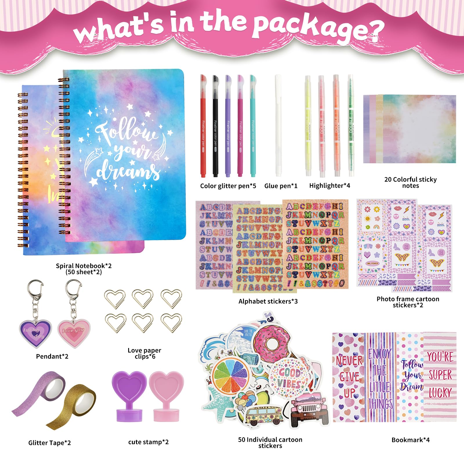 - 【Great Value DIY Journal Set】: OIHEW DIY Journal Kit has a variety of creative stuff that can be used to enhance the beauty and fun of your journal. The Girl's DIY journal kit Includes 2 spiral notebooks (50 Pages Each), 4 bookmarks, 2 pendant, 5 color glitter pen, 4 highlighter, 1 glue pen, 6 love paper clips, 3 alphabet stickers,2 photo frame cartoon stickers, 2 cute stamp,50 individual cartoon stickers, 2 glitter tape,20 colorful sticky notes, they are all arrived in a hard gift box,suit as 8 year old girl gifts, ideal 10 year old girl toy gifts ideas, girls toy gifts age 8-12.