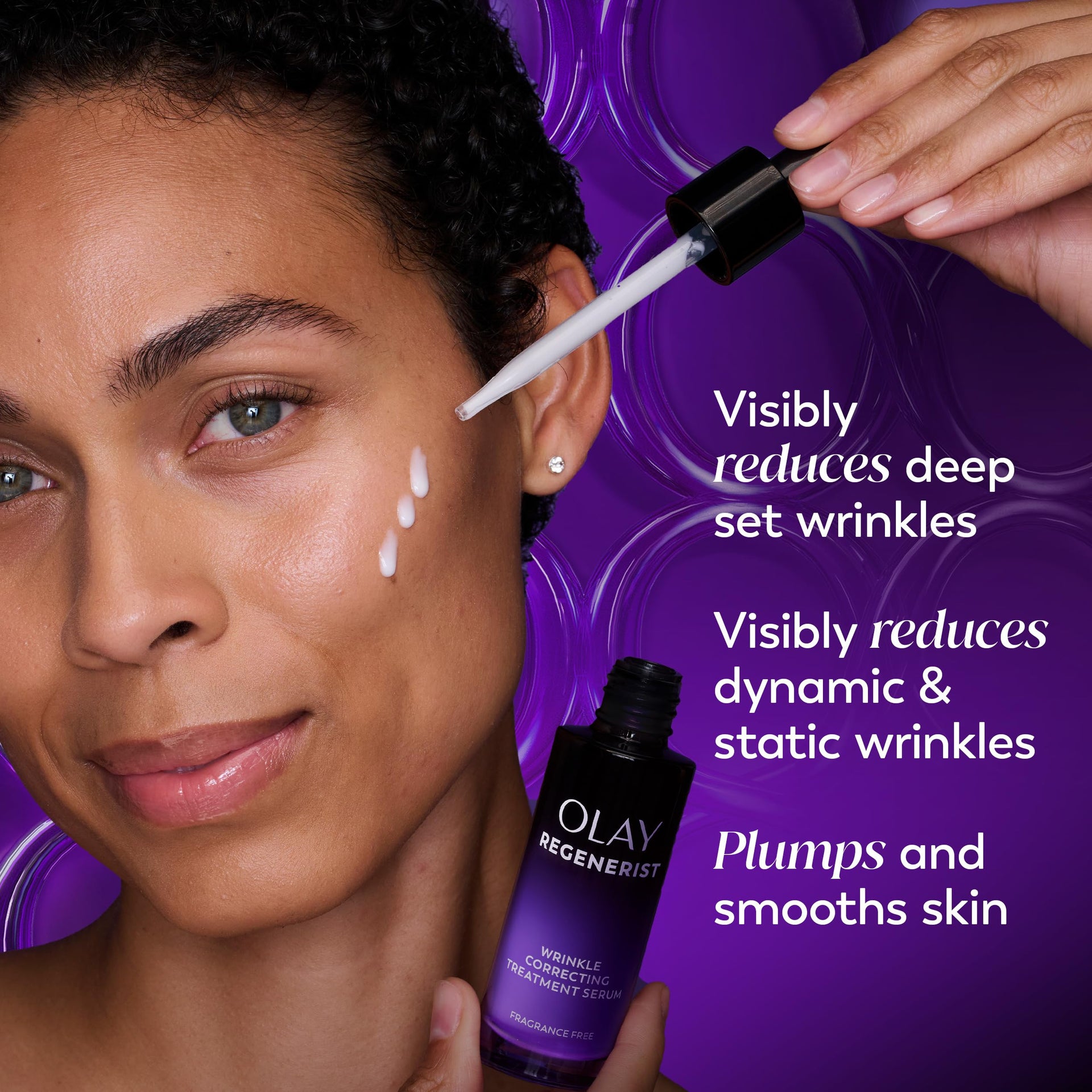 "UNVEIL YOUR BEST SKIN: Experience the Olay Regenerist Wrinkle Correcting Treatment Serum, a fragrance-free, non-invasive nightly solution designed to tackle dynamic and static wrinkles on the forehead and around the mouth. PROFESSIONAL-GRADE INGREDIENTS FORMULA: Developed by dermatologists, Designed by professionals, this serum is packed with professional-grade ingredients to visibly reduce wrinkles, offering dramatic results without drastic measures. CLINICALLY PROVEN. RESULTS: Night 1: Begins hydrating to plump and regenerate shape across the skin's surface, delivering immediate improvements in texture. Night 14: Moderate lines are visibly smoothed and reduced, enhancing your skin's natural beauty. Night 28: Significant improvement in stubborn wrinkles around the mouth and forehead, revealing a more youthful appearance. HEXA-REPAIR PEPTIDE COMPLEX: Featuring Olay's Triple Collagen Peptide and breakthrough Hexa-Peptide, this complex effectively improves the look of wrinkles and combats volume loss without procedures. PRO-RETINOL POWER: An effective and stable retinoid complex that helps correct wrinkles and smooth texture, promoting radiant and youthful skin. DEEP PENETRATION, LASTING HYDRATION: Designed by professionals, this formula penetrates deep into the skin's surface to intercellularly hydrate intracellularly and strengthen cellular bonding over time. OVER 70 YEARS OF SKIN SCIENCE: Backed by decades of research, this hydrating serum visibly repairs dynamic and static wrinkles around the forehead and mouth. Transform your nightly routine with Olay’s dermatologist-recommended solution, and repair visible signs of aging before you risk the downtime or expense of a procedure. Experience the confidence that comes with firmer, smoother skin. "