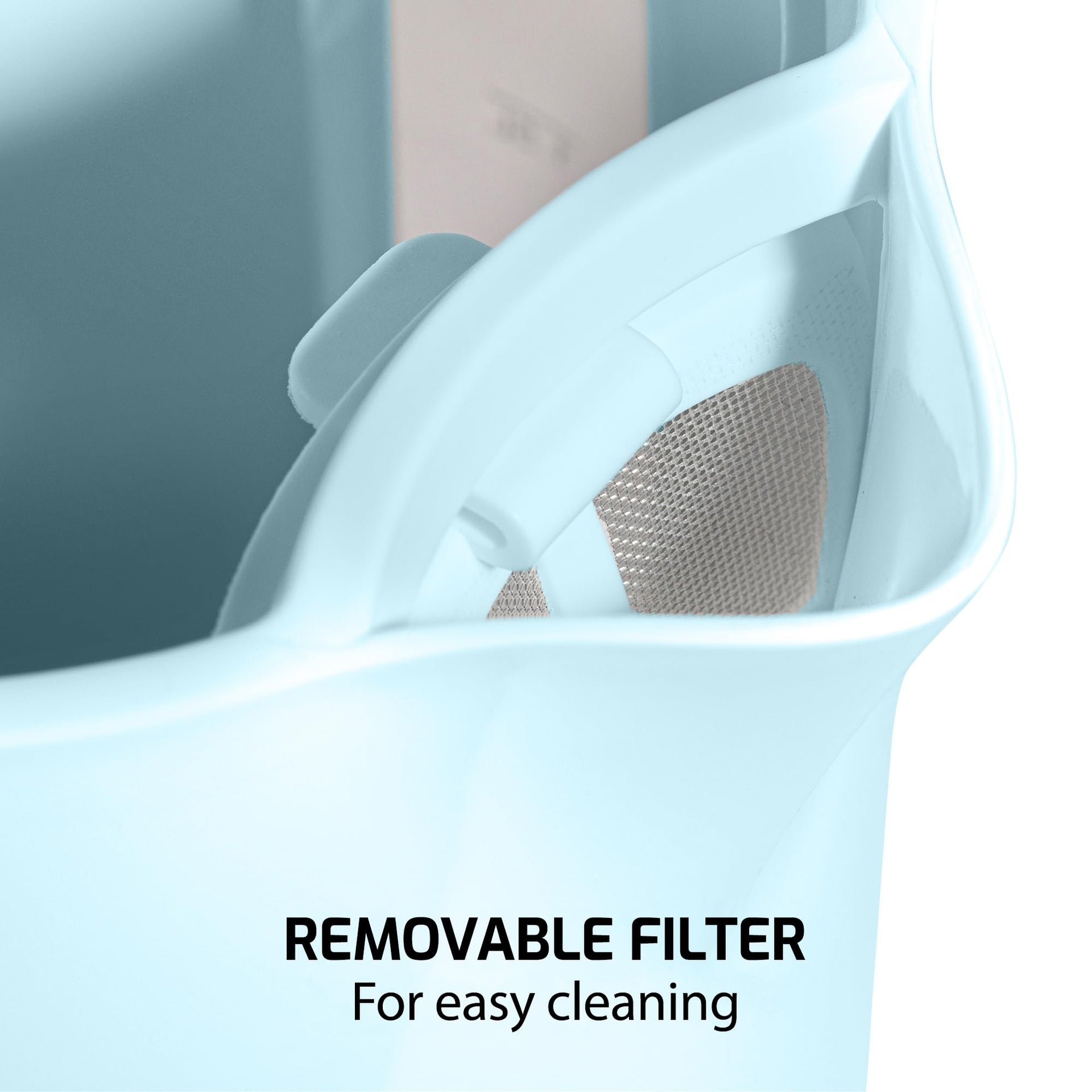 • saving both time and energy. The hinged lid opens with the touch of a button for easy use and cleaning. The spout is equipped with a removable filter, ensuring debris-free water every time. Simply slide the filter out for easy cleaning, then slide it back in for use.
